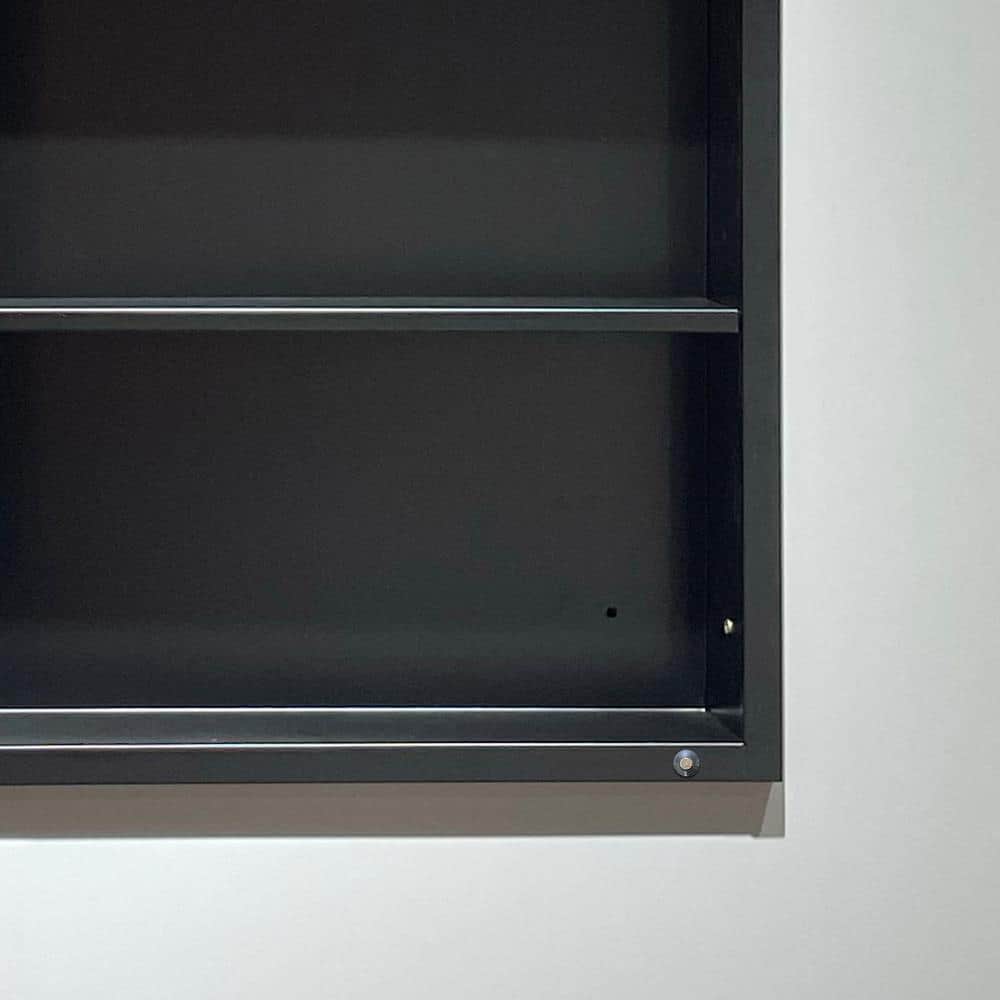 Enhance your bathroom with this sophisticated medicine cabinet, featuring a sleek black iron frame and a mirrored door. Designed for both wall and recessed installations, this cabinet offers durable storage with two spacious shelves. Its black dusted aluminum finish ensures resistance to corrosion, keeping your bathroom essentials stylishly organized.