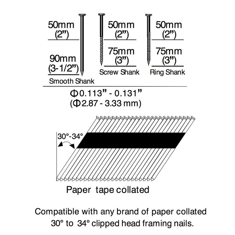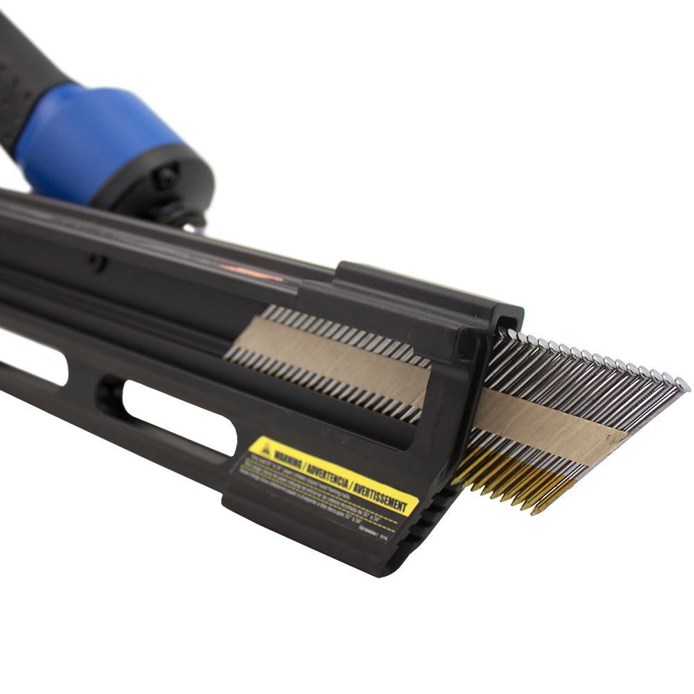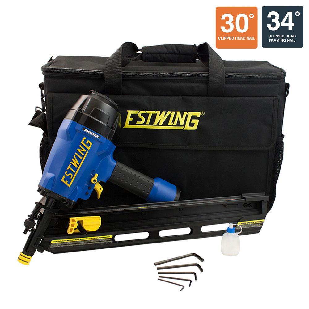 This nailer is the ideal tool for framing, decking, and fencing jobs. It features a strong, lightweight magnesium body, a 1-piece drive blade, and rubber O-rings. The no-mar tip protects surfaces from damage, but if removed will reveal teeth that grip for a secure, no-slip hold when firing. The tool-free depth adjust provides a variety of options for driving depth, while the air filter and anti-dust cap help keep the interior of your tool clean and functioning smoothly. The 1/4 in. Industrial NPT swivel fitting rotates 360° for maximum accessibility in tight spots. Hang your nailer up with the integrated rafter hook when you need to free up an extra hand. You can quickly switch from bump to single fire using the select fire trigger. It features an anti-dry fire mechanism that protects the internal parts by stopping any firing when there are only a few nails. Insert an additional strip of nails through the rear-load magazine, and you are ready to go. This nailer is designed to use 30 to 34° paper collated clipped head framing nails between 2 and 3-1/2 in. L (0.113 in. to 0.131 in. shank), and is compatible with any brand. The 34° Clipped Head Framing Nailer (Model: EFR3490) is suitable for any professional or do-it-yourselfer, and is high-performing in both indoor and outdoor applications. This framing nailer is part of Estwing's professional line of pneumatic tools, and is covered by a 5 Year Professional Tool Warranty and a 90-Day Wearable Parts Warranty.