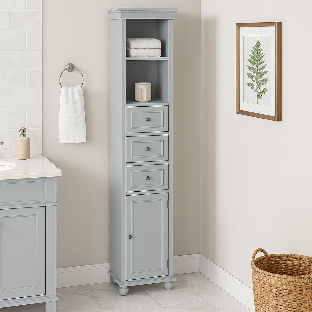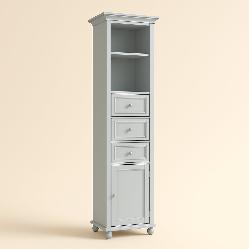 The Hampton Harbor Linen Cabinet combines style and functionality with its slender design, dove grey finish, and ample storage options. Perfect for compact spaces, it features adjustable shelves, drawers, and decorative details like crown molding and bun feet.