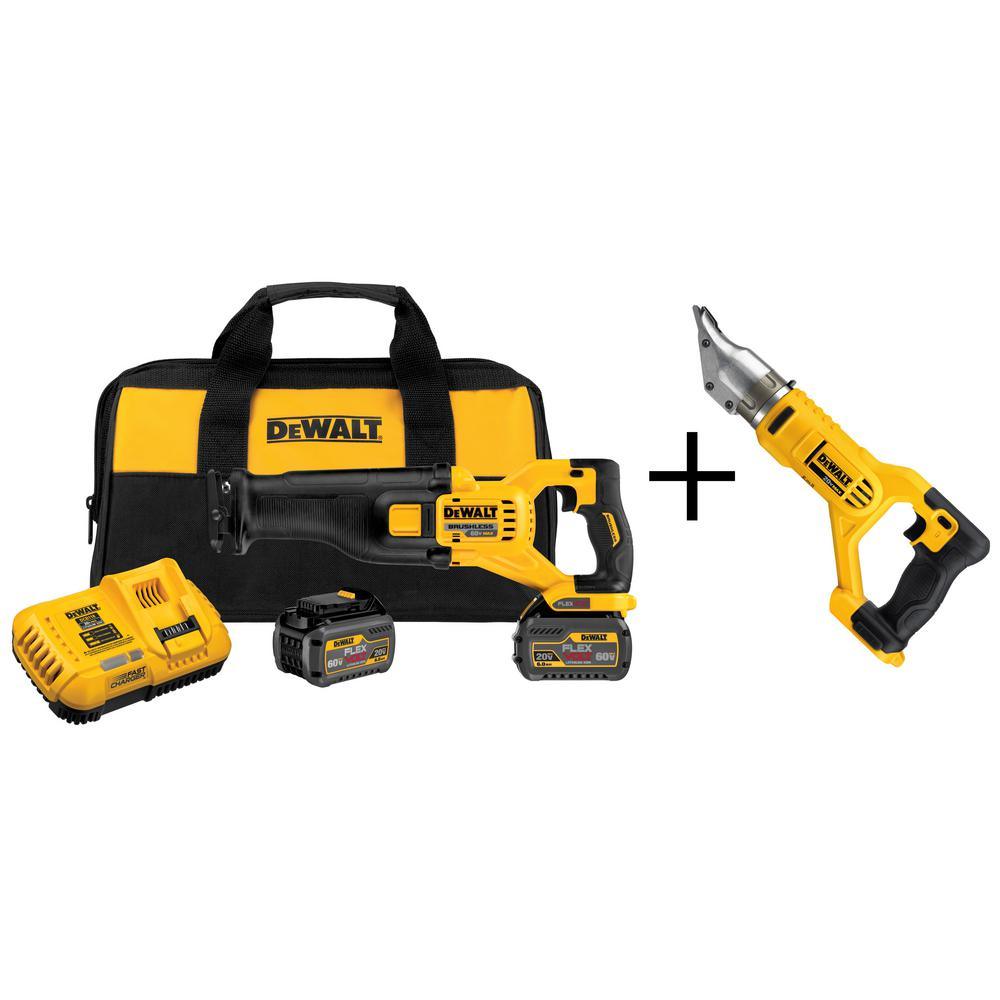 FLEXVOLT 60-Volt MAX Lithium-Ion Cordless Brushless Reciprocating Saw with (2) Batteries 2Ah and Bonus Swivel Head Shear