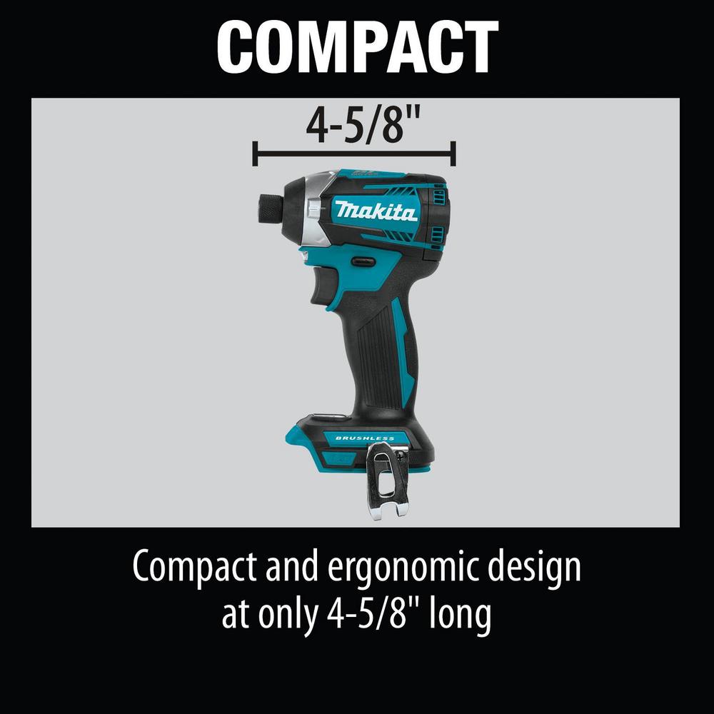 The Makita 18-Volt LXT Lithium-Ion Brushless Cordless Quick-Shift Mode 3-Speed Impact Driver (model XDT14Z, tool only) is a best-in-class fastening solution for users who want more torque, longer run-time, and precision fastening features. The XDT14Z delivers all of the above in a compact size with a superior power-to-weight ratio. The XDT14Z combines a full 1,550 in. lbs. of fastening torque with category-leading precision features. Quick-Shift Mode is an automatic electronic controller that downshifts and reduces rotation and impact speed prior to driving the screw into place. It is engineered to minimize screw thread stripping, screw breakage and damage to work. For faster tightening of self-drilling screws, use the Tightening Mode (T-mode) and avoid damage to the screw or work piece. These precision settings, combined with 3-speed power settings, give users more control for a wide range of fastening tasks from cabinet screws and deck screws to lag bolts, and much more. It is only 4-5/8 in. long and ideal for work in tight spaces. Star Protection is communication technology that allows the Star Protection-equipped tool and battery to exchange data in real time and monitor conditions during use to protect against overloading, over-discharging and overheating. For increased versatility, the tool can also be powered by Makita 18-Volt LXT and Compact Lithium-Ion batteries with the star symbol on the battery indicating Star Protection inside.