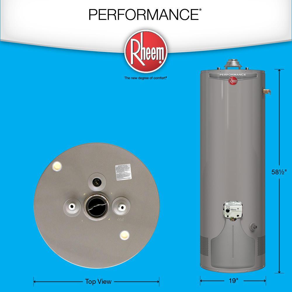The Rheem Performance 40 Gal. Natural Gas Ultra-Low NOx Water Heater does not require an electrical outlet and features push-button ignition for match-free start up, making it a perfect for replacement of an existing water heater. Provides ample amount of hot water for households with 2 to 4 people. Plus, it includes a 1-year in-home labor warranty in addition to a 6-year tank and parts warranty. Enjoy peace-of-mind with a reliable hot water solution from Rheem. installation.