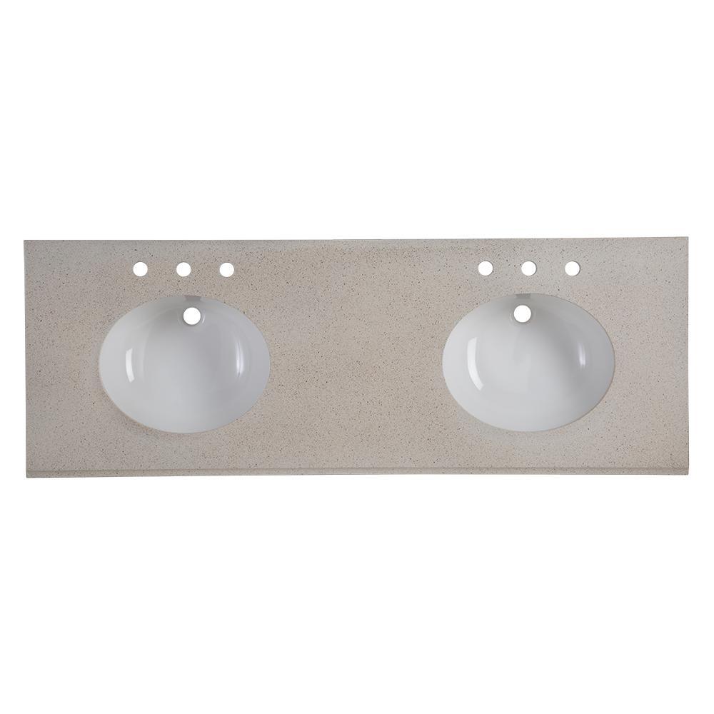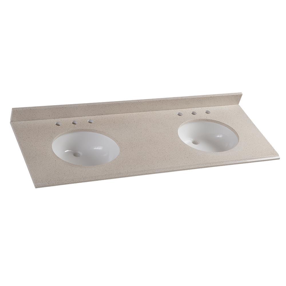 The Glacier Bay 61 in. W Colorpoint Maui Double sink Vanity Top is the perfect addition to any home looking to make an attractive and charming change to their bathroom. The Colorpoint Maui color consists of a beige base with small freckles of light gray and brown distributed throughout the entirety of the vanity top finish. Your Colorpoint Maui vanity top is designed to fit a 60 in. W x 21 in. D vanity cabinet and comes factory assembled with a pre-attached white oval under-mount bowl for your convenience. Easy to install, with matching backsplash, the Maui vanity top is the ideal choice for a warm and inviting home.