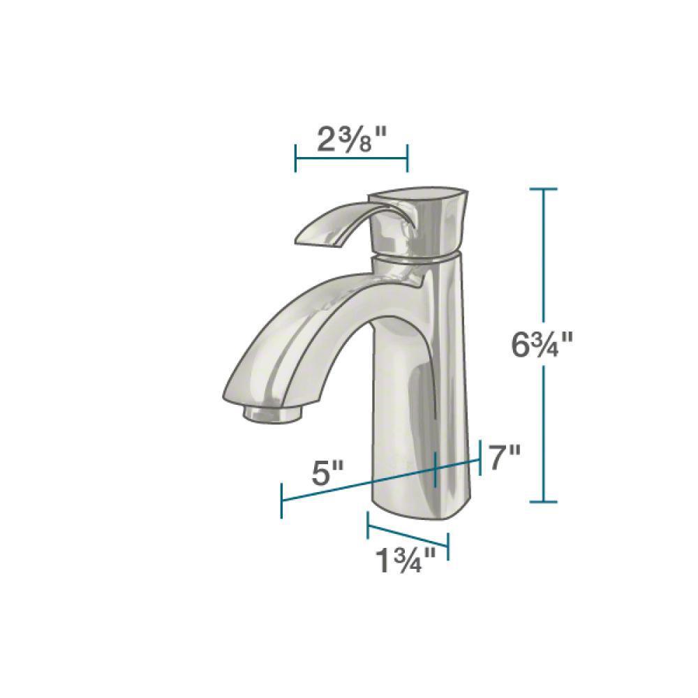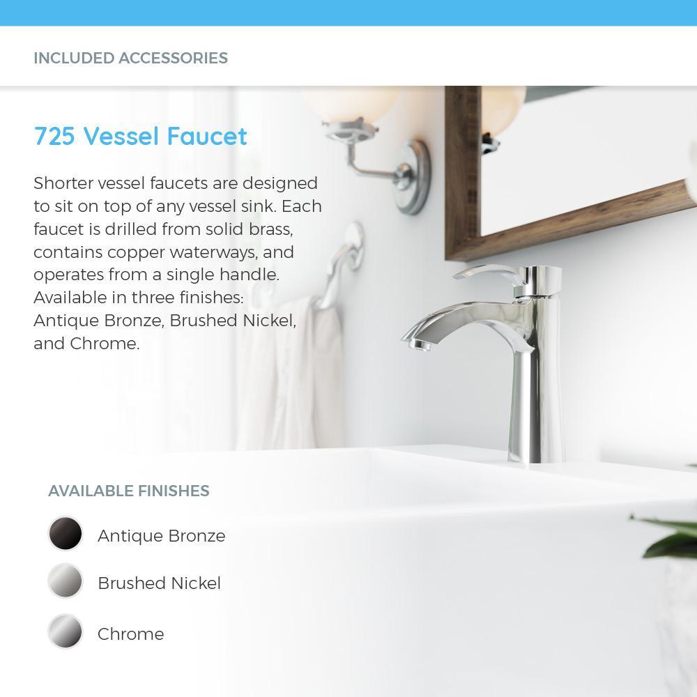 This bowed rectangular vessel features a flat platform along its back with a pre-drilled faucet hole and overflow. The additional vitreous china coating on this model creates an even more impervious and sanitary surface than standard porcelain. With an overall measurement of 22 in. x 19-5/8 in. x 6-5/8 in., it will require a minimum-width cabinet of 24 in. The 725-BN single-handle, vessel faucet is a shorter version of the 726, for use with vessel sinks which have pre-drilled faucet platforms. Standing at a 6.75 in. height with a 5 in. spout reach, its sleek lines gradually widen and contract to create a stunning design statement. The single, curved handle echoes the arch of the faucet and easily sets just the right water flow and temperature. Ceramic disc cartridges assure long-term, dependable operation, and a beautiful brushed nickel finish completes its distinctive appearance. The faucet is constructed without lead and is compliant with NSF (National Sanitation Foundation) standards, the Safe Drinking Water Act, the cUPC (Uniform Plumbing Code of the United States and Canada), the ADA (American Disabilities Act) and carries the EPAs WaterSense label. Additionally, a spring-loaded, vessel pop-up drain (vpud) is included, which opens and closes with a simple press to its attractive brushed nickel cap. Due to the design of some vessels and their open backs, faucet hardware and unfinished areas may be seen if installed directly in front of a mirrored surface.