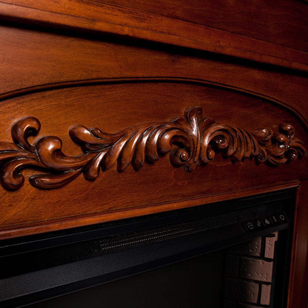 Boldly ignite your living area with this ornately detailed, classically carved electric fireplace in autumn oak. Bookending shelves echo the molding on the mantel and provide ample storage for reading materials, media accessories or pottery. The firebox has multicolor flames, glowing embers and an interior brick design for a lifelike look. Traditional styling combines with mission inspired accents to make this fireplace a must in every home. Energy efficient LED bulbs light the fire, a cost effective way to ignite bliss in any room without professional installation. User friendly remote control offers 4-way adjustability to customize the fireplace from the comfort of your sofa. Flames and logs each have 5-level adjustment or off. An automatic shutoff and glass that remains cool to the touch ensure the fireplace warms safely. Turn off the heat to enjoy the fireplace ambience year round.