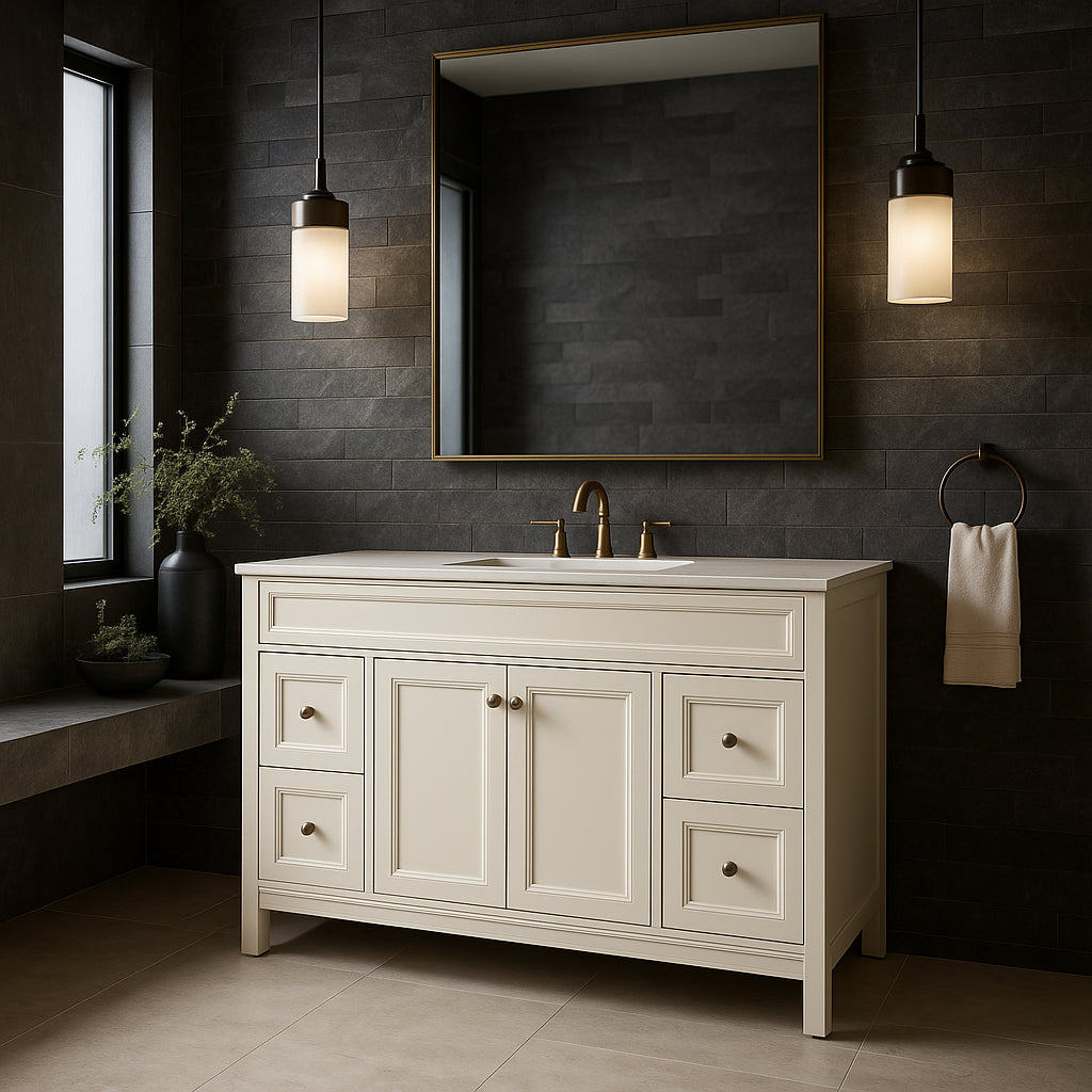 The Brinkhill 60-inch Bathroom Vanity Cabinet in Cream combines elegant design with practical functionality. Featuring soft-close doors, spacious drawers, and a durable engineered wood structure, this vanity is perfect for enhancing your bathroom's style and storage.