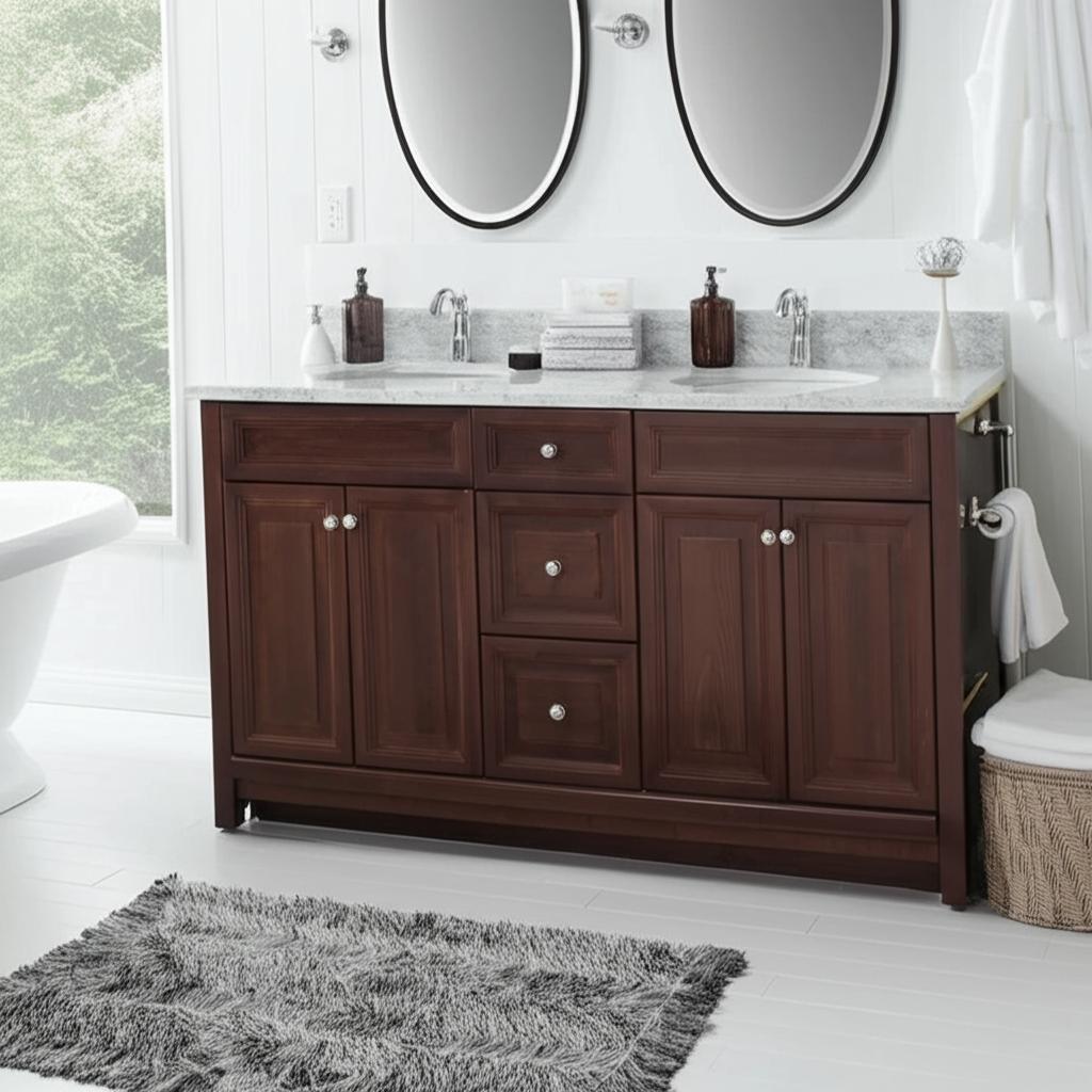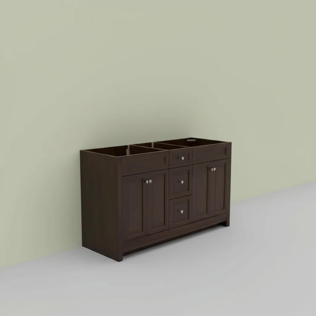 The Brinkhill 60-Inch Bathroom Vanity Cabinet in Cognac combines timeless design with modern functionality. Featuring soft-close doors, spacious drawers, and polished nickel hardware, this vanity is perfect for enhancing your bathroom's style and storage.