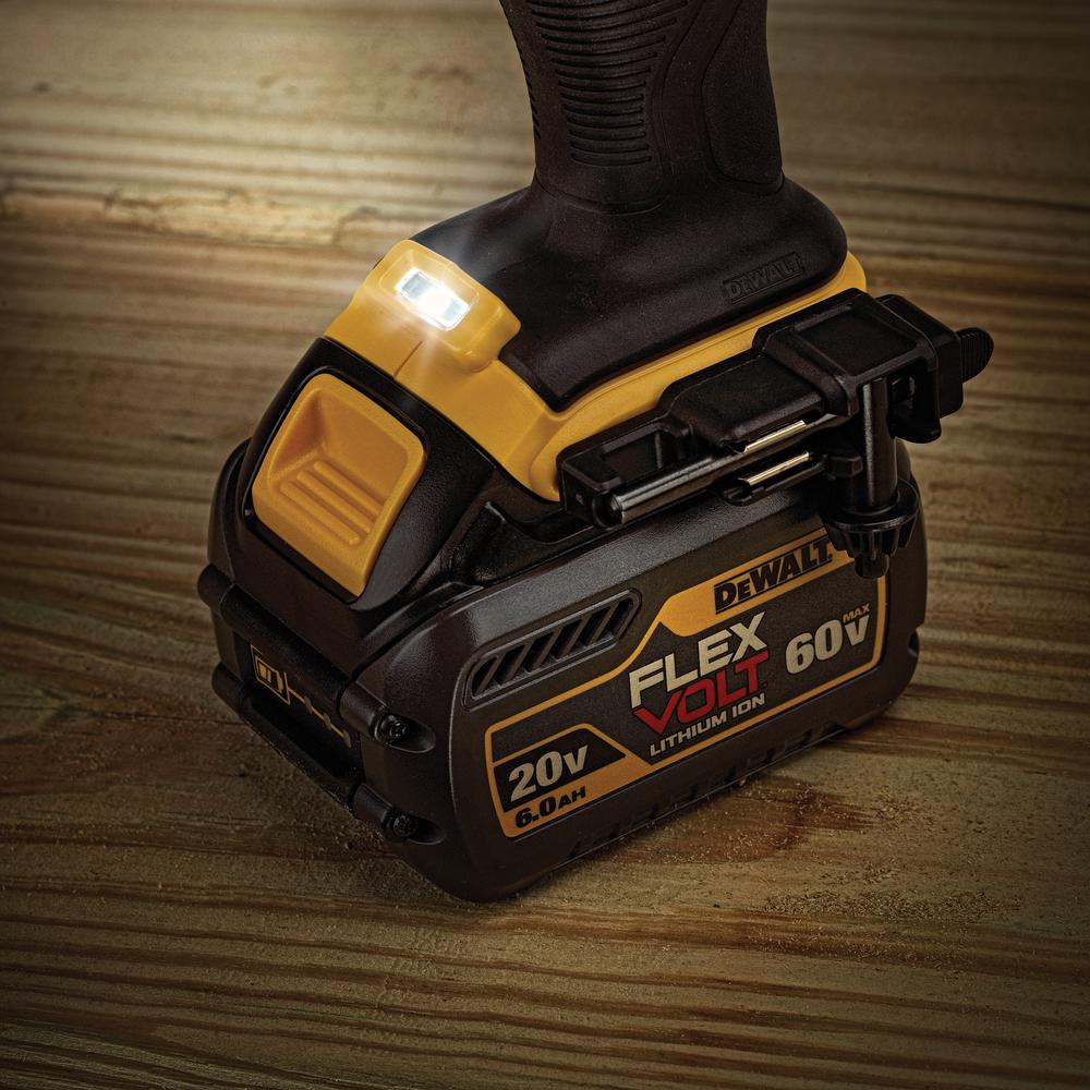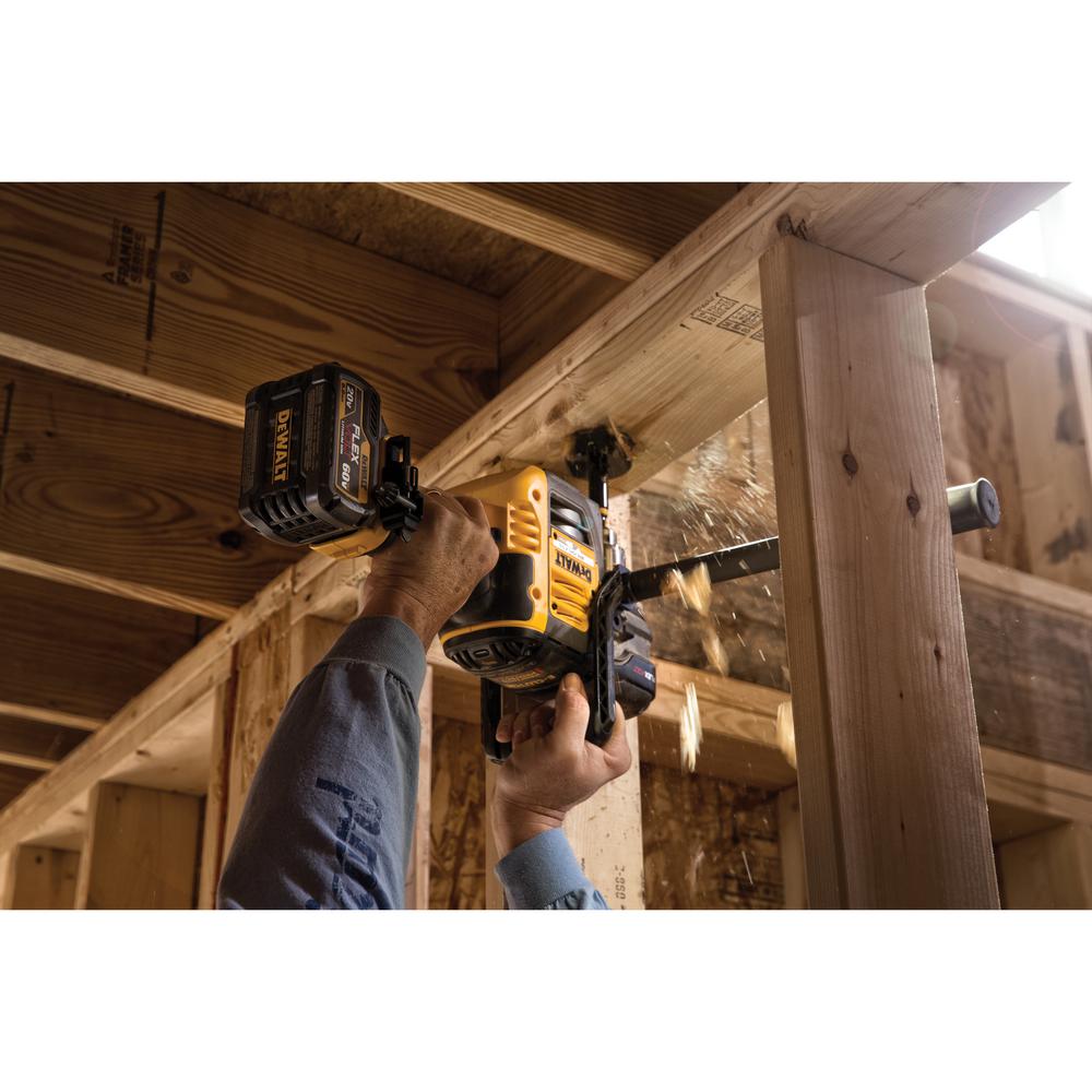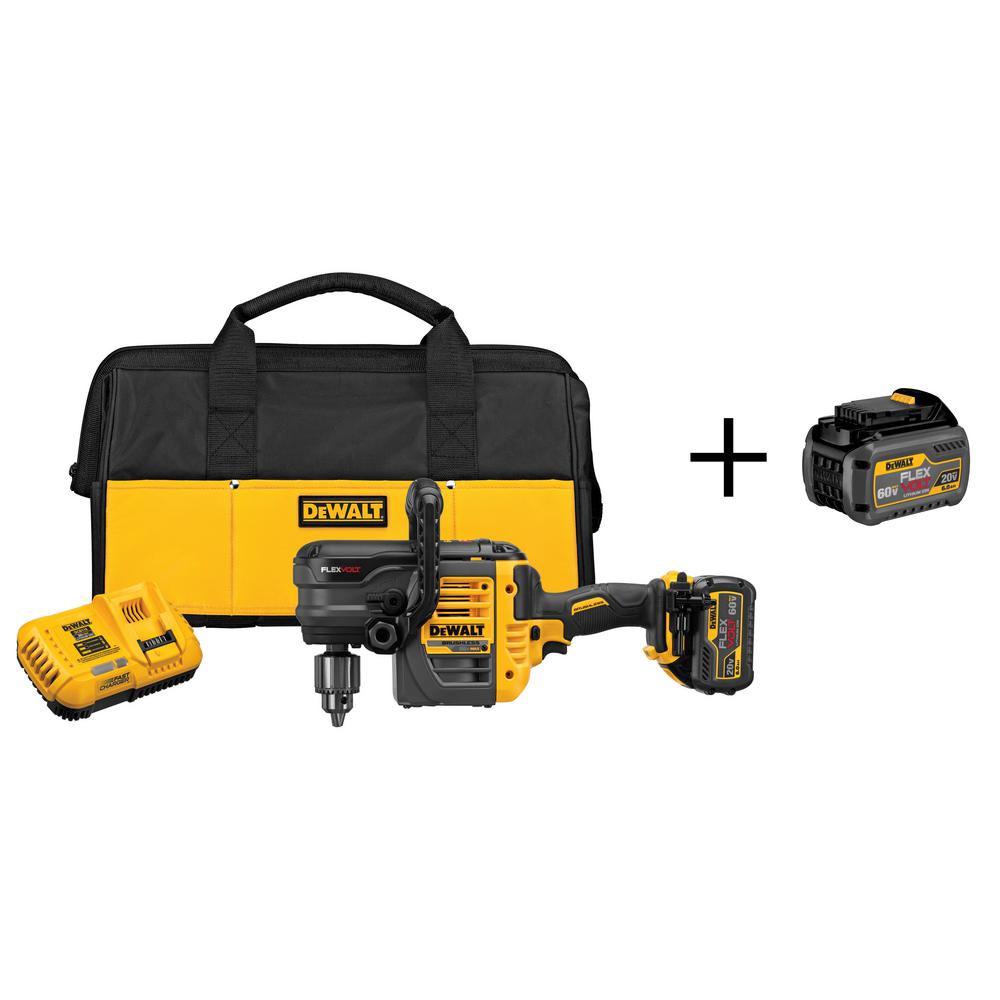 The DEWALT 60-Volt Max VSR Stud and Joist Drill with E-Clutch System features a 1/2 in. chuck and brushless motor that provides corded power in a cordless solution. Ideal for plumbers, electricians and HVAC installers who need to drill large diameter holes in wood. This drill provides exceptional power, control, durability, and runtime with its 60-Volt brushless motor, mechanical and electrical clutches, and 2 variable-speed ranges. Equipped with the innovative bind-up control feature called E-Clutch System this drill increasing user control in bind-up/stall situations by sensing a stall during use and managing torque accordingly. For a limited time get a bonus FLEXVOLT battery pack with purchase.