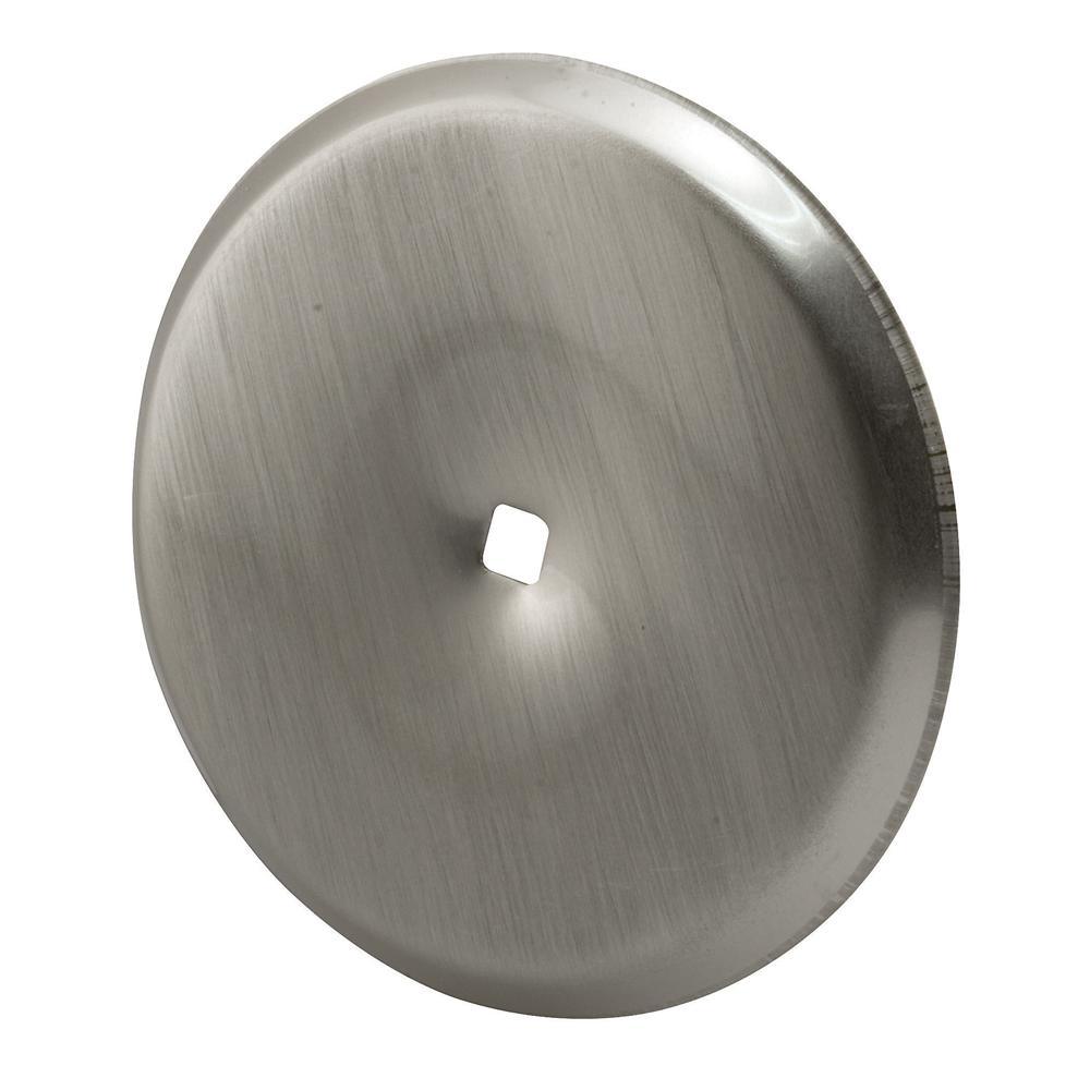 These cabinet knob back plates are constructed of stamped steel and come in a satin nickel plated finish. Back plates like these are used on both cabinet doors and drawer faces to prevent the wearing of finished wood, and the unsightly accumulation of dirt and grime. They feature a large 2-13/16 in. outside diameter and they project outward a total of 3/16 in. These cabinet knob back plates do not include any installation fasteners, but they come with pre-punched holes for quick and easy installation.
