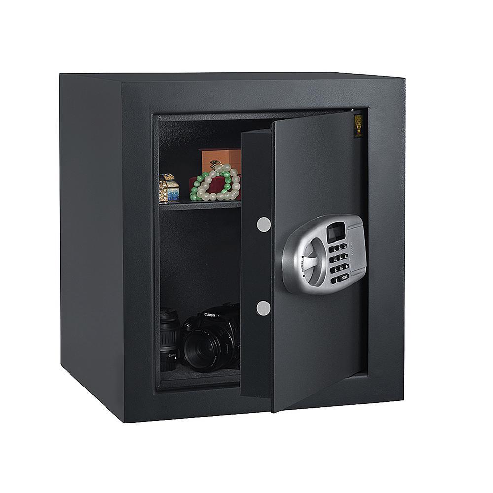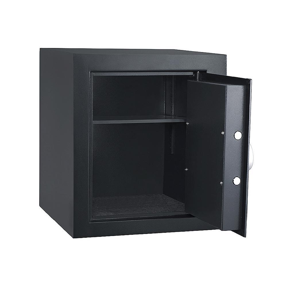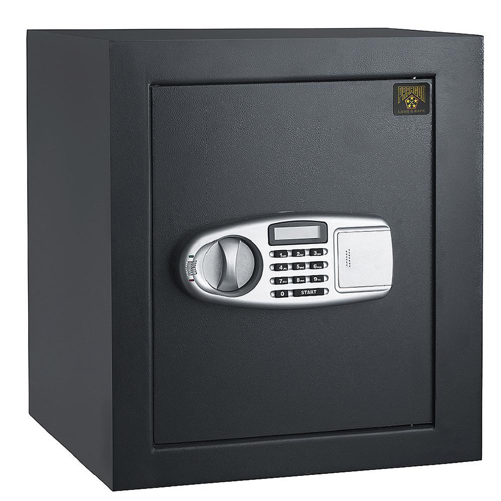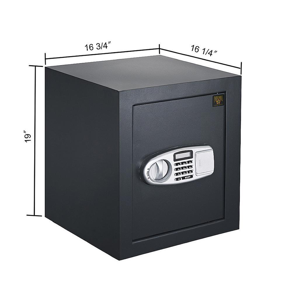 This is the Quarter Master FR7800 Digital Keypad Fire Resistant Home Office Security Safe. Easily store and keep valuables safe at home or office with this digital safe; works with included key or your own customized digital code you program. For added security, we've made the hinges concealed so they're tamper-proof. It is perfect for the home, office, or work place. Features: Digital entry eliminates the need for making multiple key copies. Includes 1 Interior Shelf. Fire Rated. Total wall rated at 1700° F. at 30 minutes. Can be programmed up to 2 PIN numbers (digit codes). Opens with secret PIN code or included keys. Safe door opens to the right. Pre-drilled holes inside the safe with fixing bolts allowing anchoring. Inside tamper-proof hinges. Size: 16.75 in. W x 19 in. H x 16.25 in. D. Interior Dimensions: 13 in. x 17 in. x 14 in. Double walls with fire resistant fiber insulation. Inner Layer Steel Thickness: 1.5mm. Outer Layer Steel Thickness: 2 mm. Door Thickness: 5mm. Finish: Epoxy Powder coating. Equipped with EA keypad electronic digital operating system. Removable Shelf. Key lock override system. Opens with secret PIN code or included keys (2 Free Keys). Simple programmable Electronic Lock with buzzer and LED. 3 to 8 numbers. Code can be changed infinitely. Runs on AASIZE(1.5-Volt) batteries. Constructed with solid steel to resist hand and mechanical tool attacks. Weight: 77 lbs. Color: Dark Grey.