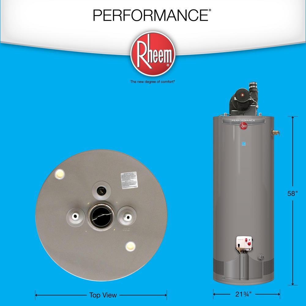 The Rheem Performance 50 Gal. ultralow NOx natural gas power vent water heater provides an ample supply of hot water for a house hold size of 3-people to 5-people. The 38,000 BTU/hour ultra-low NOx burner has a recovery rate of 36.4 Gal. at a 90-rise. The flexible venting options offer a wide range to fit most installations. Long venting lengths up to 100 ft. with 2 in. or 3 in. PVC, ABS, or CPVC vent pipe options. This unit features a durable spark-to-pilot igniter and installed temperature and pressure relief valve.