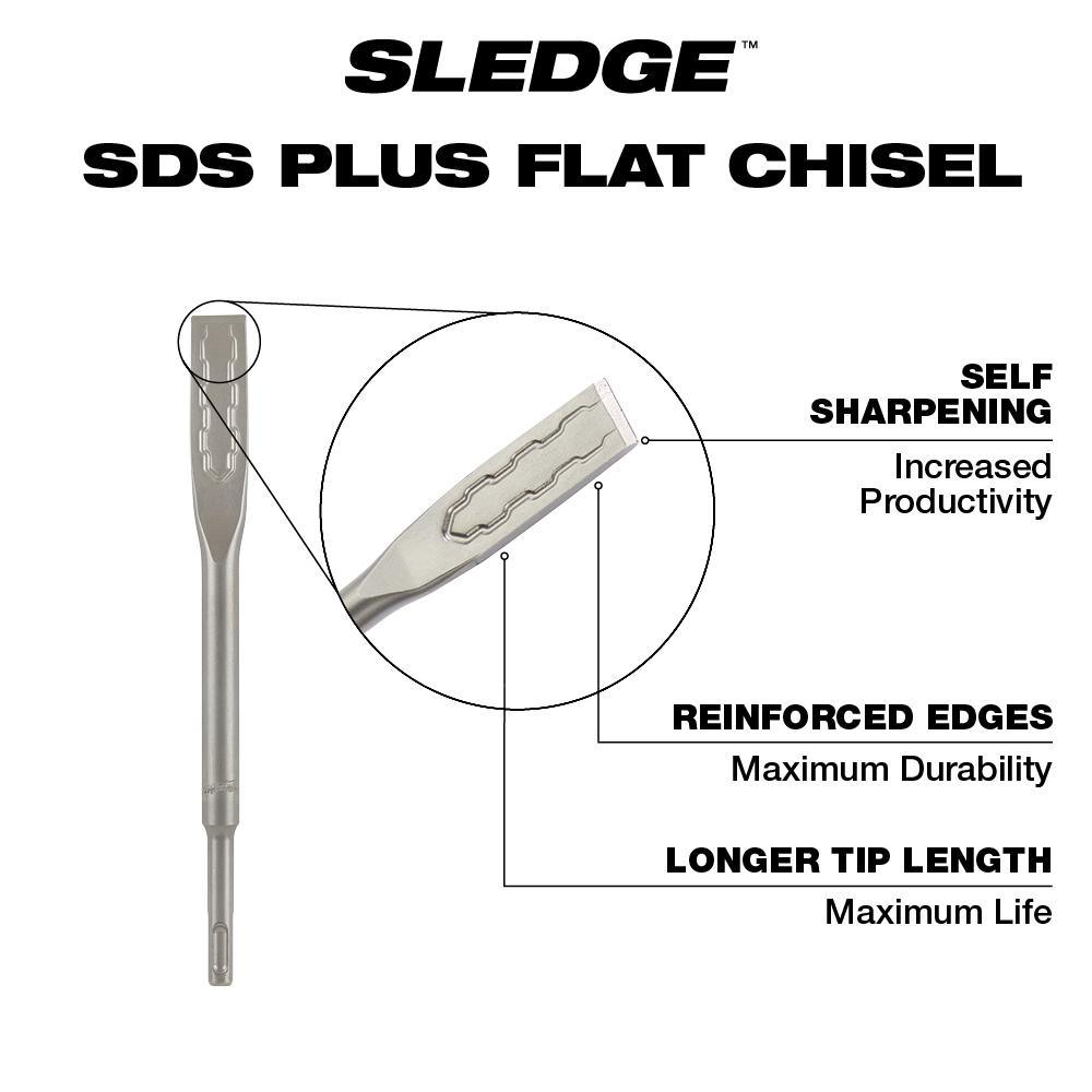 The Milwaukee SDS-PLUS SLEDGE 3/4 in. X 10 in. Flat Chisel stays sharper longer. Reinforced edges deliver maximum durability and reduced wear over the life of the chisel. Engineered to maintain sharper edges for increased productivity. Featuring a longer tip length vs. standard chisels for maximum life. The SLEDGE Flat Chisel is ideal for general chipping and breaking concrete. No re-sharpening or re-hardening is necessary, reducing downtime. The high grade forged steel delivers maximum durability. The SDS-PLUS SLEDGE 3/4 in. X 10 in. Flat Chisel is designed for use with SDS PLUS rotary hammers and offers longer life in concrete demolition over standard Milwaukee chisels.