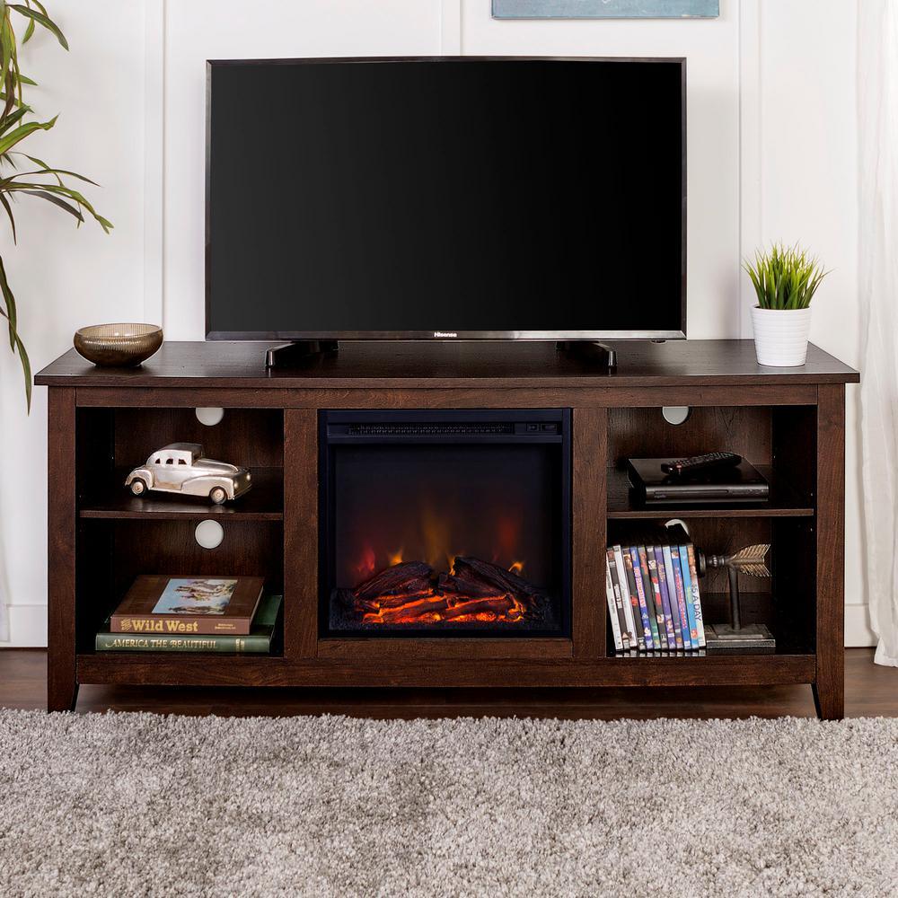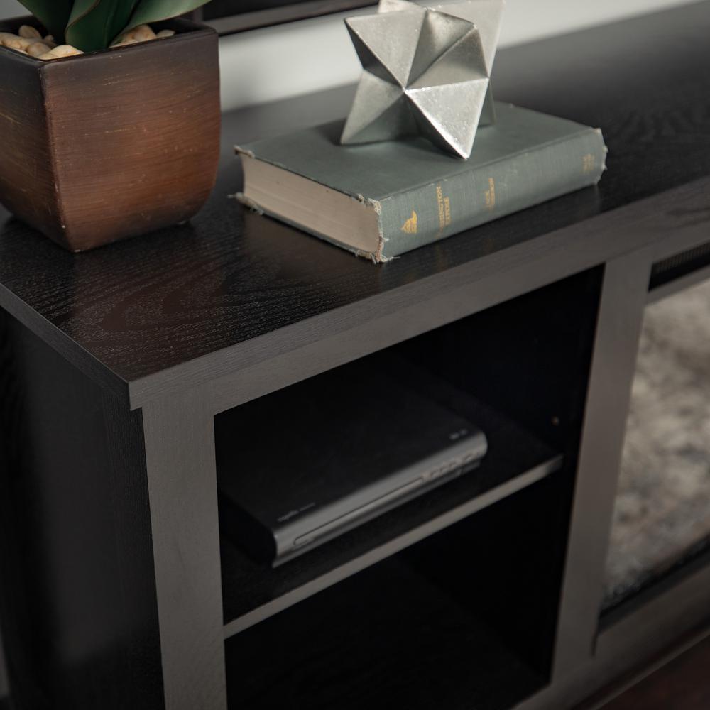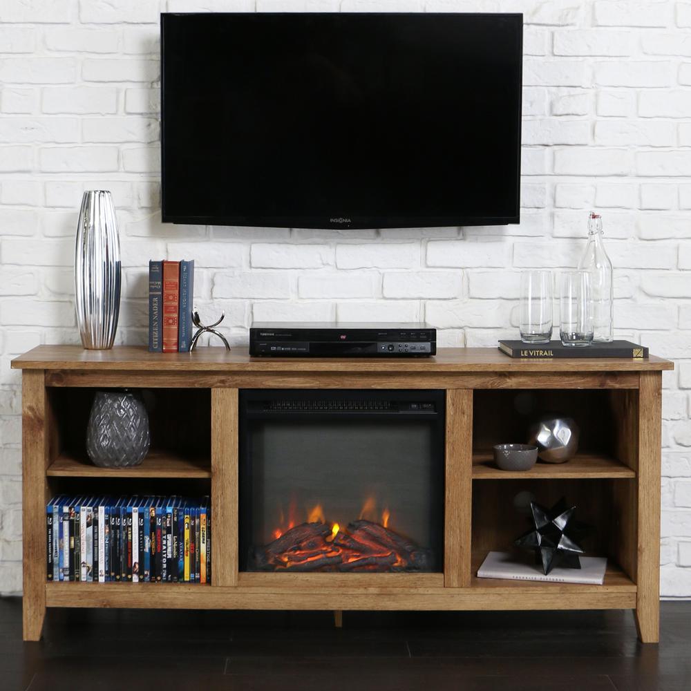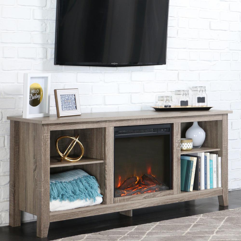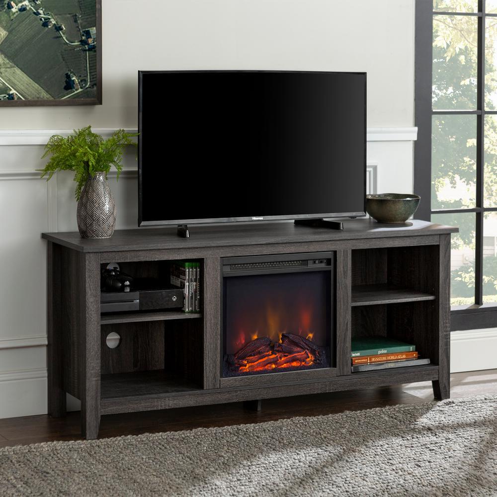 Display your TV in style with this 58 in. TV stand and electric fireplace. Crafted from high-grade MDF with a durable laminate finish for a rich, textured surface, this storage console features two adjustable shelves on both sides of the fireplace for anything from your electronics to your home décor. With a cord management port at the back of each shelving space, you’ll never have to worry about a tangled mess of wires as it’ll keep them organized. This entertainment center mixes a traditional style with the on trend rustic farmhouse look with its simple design and will be a classic piece to your living room. This media stand will accommodate most flat-panel TVs up to 60 in. Installation for the fireplace requires no technician, simply plug into any standard household outlet.
