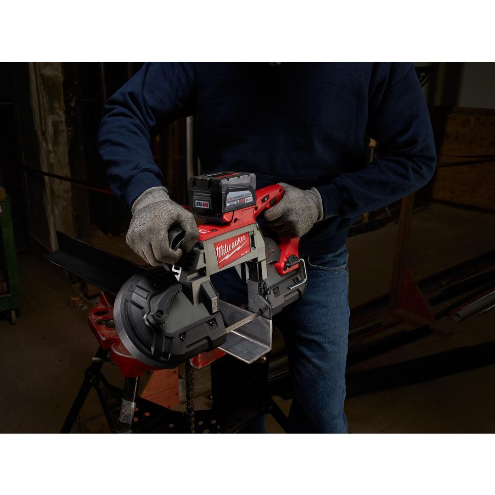 The M18 FUEL Band Saw cuts faster than its corded counterparts, provides the same legendary durability of a Milwaukee corded band saw and delivers up to 5X more run time than other cordless options. Utilizing a POWERSTATE Brushless motor and Constant Power Technology, the M18 FUEL Deep Cut Band Saw cuts faster than corded band saws. It also delivers the same legendary durability that has made Milwaukee Corded Deep Cut Band Saws second to none for decades by utilizing over 90% of the same parts. Equipped with Jobsite Armor Technology, the tool is better protected from drops and debris with a proprietary composite material and crush zone barriers to absorb impacts. The M18 REDLITHIUM HIGH DEMAND 9.0 Battery Pack delivers up to 5X more run-time, 35% more power and runs 60% cooler than standard 18-Volt lithium-ion batteries. It maintains full power and runs substantially cooler through heavy applications, allowing users to push their cordless tools harder and longer than ever before. The M18 REDLITHIUM HIGH DEMAND 9.0 battery is fully compatible with 175+ M18 tools. REDLINK PLUS Intelligence has the most advanced system of cordless power tool electronics, providing optimized performance, electronic clutch and overload protection using total system communication between tool, battery and charger. The M18 FUEL Deep Cut Band Saw features a tool-free locking adjustable shoe that can adjust from an extended shoe to no shoe in seconds.