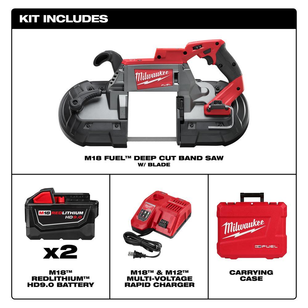 - Includes: (1) M18 FUEL deep cut band saw (bare tool) (2729-20); (2) M18 REDLITHIUM high demand 9.0 battery packs (48-11-1890); (1) M18 and M12 rapid charger (48-59-1808); (1) blade; (1) carrying case