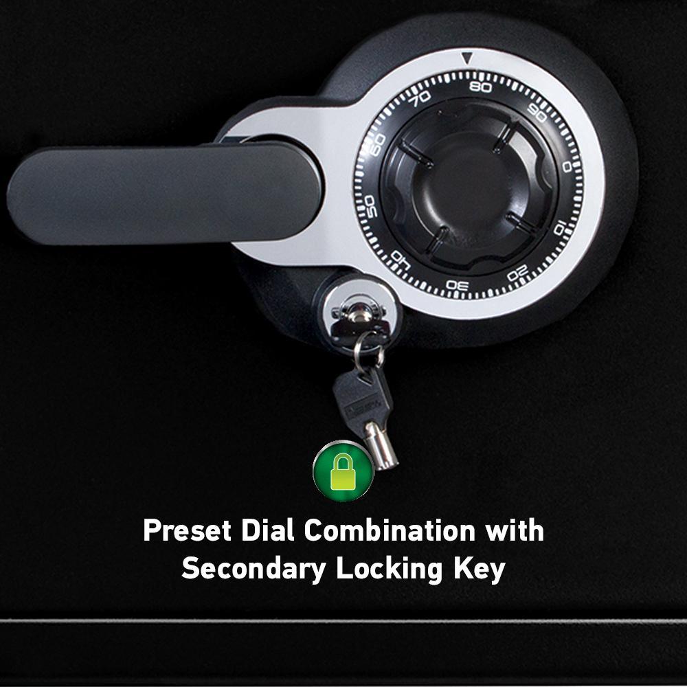 • Preset dial combination fire safe with secondary locking key for strong security; combination safe features three live-locking bolts, steel construction, pry-resistant hinge bar, tray, and bolt down hardware