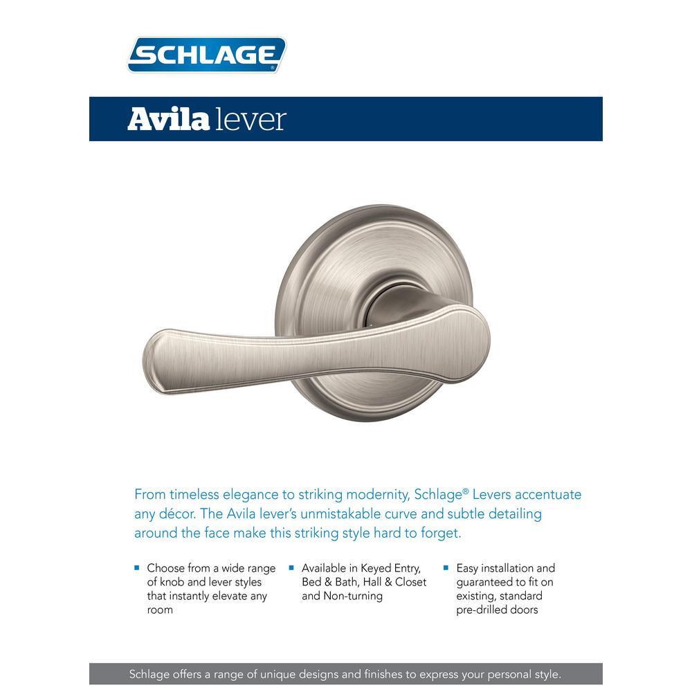 The Schlage Avila Satin Nickel Privacy Door Lever is perfect for interior doors where locking is needed, such as bedroom and bathroom doors. The Avila lever's unmistakable curve and subtle detailing make this a striking style hard to forget - especially when wrapped in our versatile Satin Nickel finish. Its universal design allows it to be mounted to left or right swing doors. Plus, it's been designed and tested with strength and durability in mind.