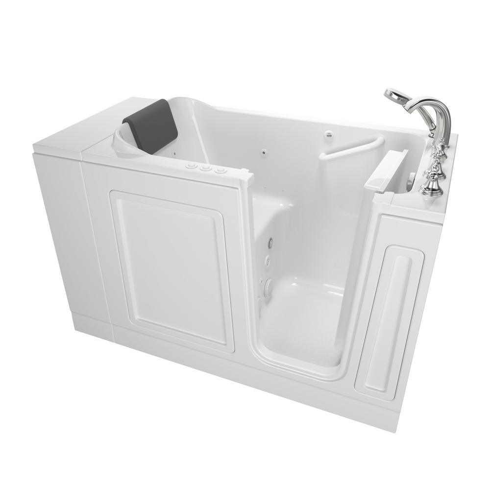 The American Standard 28 in. x 48 in. Acrylic walk-in bath provides a similar bathing experience to larger models but fits in smaller spaces and uses less water. The included tub extender allows this tub to retrofit in the same space as a standard bathtub. The full sized, V-shaped door with a low door threshold allows ease of entry and exit. Fully equipped, the 119 Premium Series offers all the latest in safety and comfort features with the most advanced therapeutic options therapeutic options and backed by a lifetime warranty on the door seal, a 15-year warranty on the tub shell and a 10-year warranty on all other components.