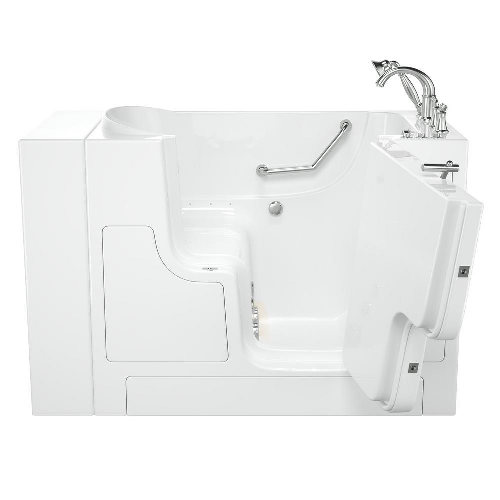 The American Standard 30 in. x 52 in. Gelcoat walk-in bath provides a similar bathing experience to larger models but fits in smaller spaces and uses less water. The included tub extender allows this tub to retrofit in the same space as a standard bathtub. The full sized, outward opening, V-shaped door with a low door threshold allows ease of entry and exit. Fully equipped, the 709 Value Series offers all the latest in safety and comfort features with the most advanced therapeutic options and backed by a lifetime warranty on the door seal, a 10-year warranty on the tub shell and a 5-year warranty on all other components.