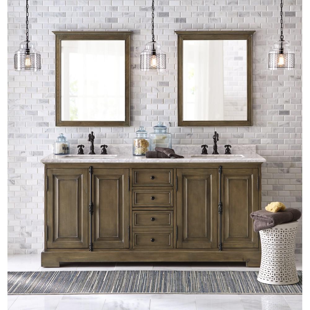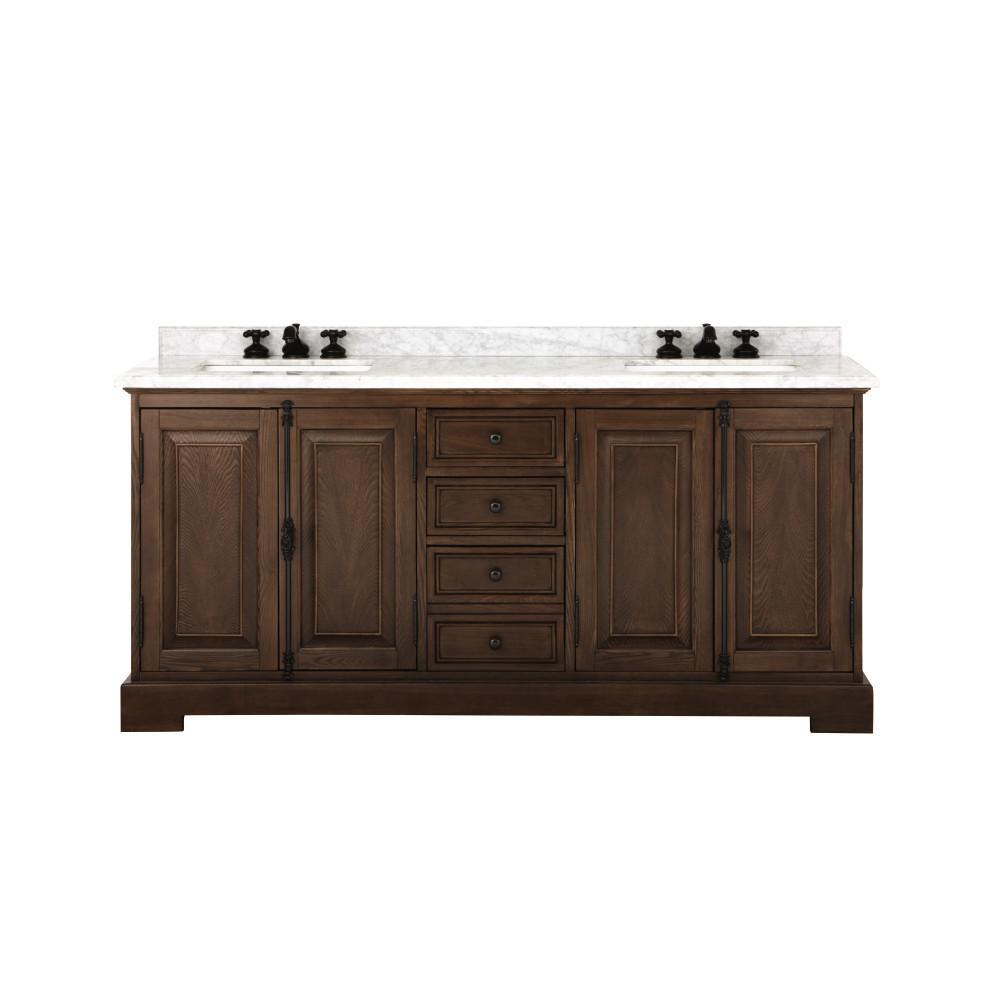 Add a transitional look to your bathroom with the traditional style and modern lines of this 72 in. Clinton double vanity. Its angles form a shallowly stepped pedestal base with block-style feet that give way to a perfectly straight toe kick. The unique double sink features real Italian Carrara marble, which may contain swirling or veining that accentuates the beauty of the natural stone. The vanity’s classic raised panel doors and drawers are highlighted by elegant iron hardware. The vanity top is pre-drilled for two three-hole faucets with an 8-in. spread. The faucets are sold separately. It is fully assembled for your convenience.