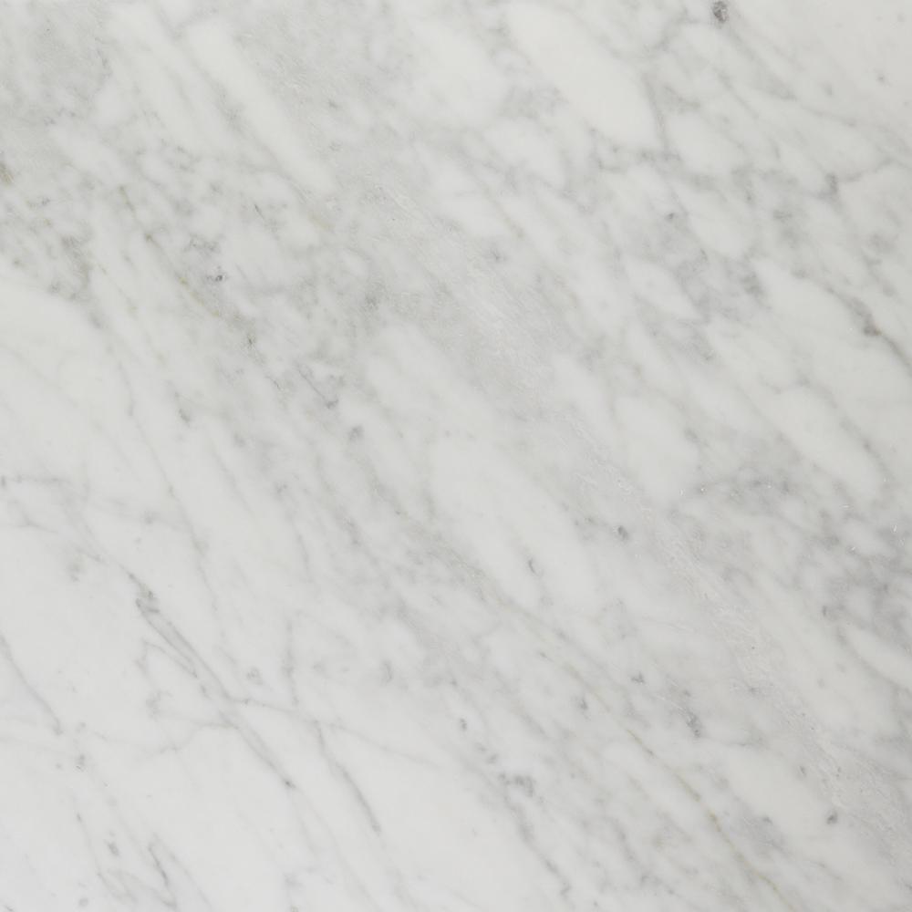• White Italian Carrara marble top is pre-drilled for two three-hole faucets with 8-in. spreads