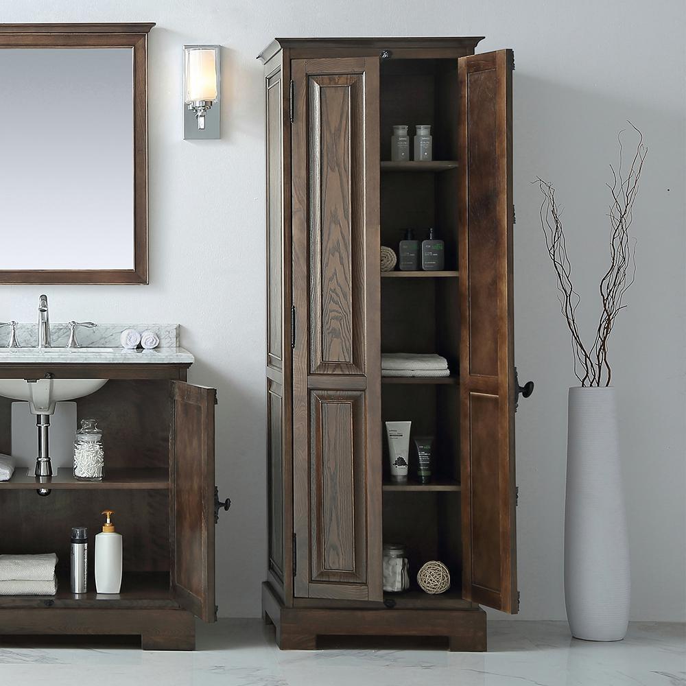 Clean lines and a mix of modern and classic design elements give our Clinton Linen Cabinet lasting appeal. Rising up from a shallowly stepped base with a straight toe kick, this tall linen cabinet offers transitional style with plenty of storage. Behind the raised panel doors, four adjustable shelves stand ready to organize toiletries, towels and other supplies. Embrace unique style with this bathroom storage cabinet.