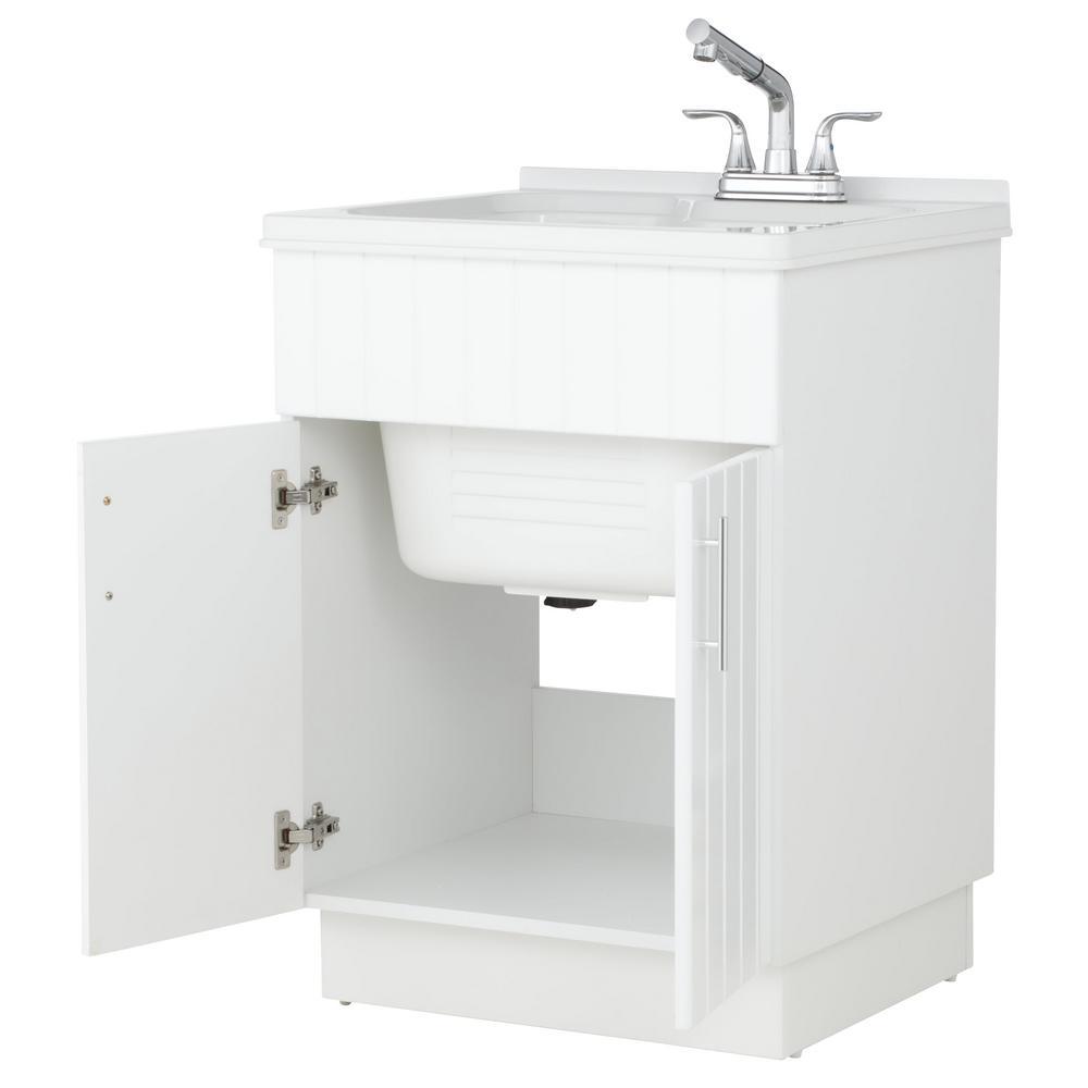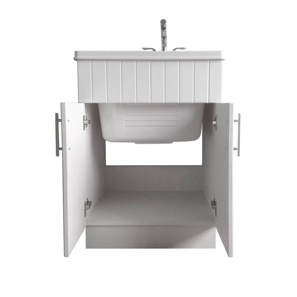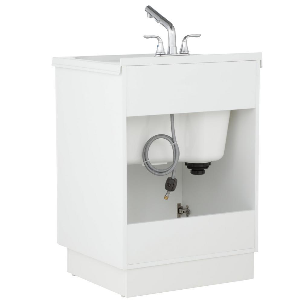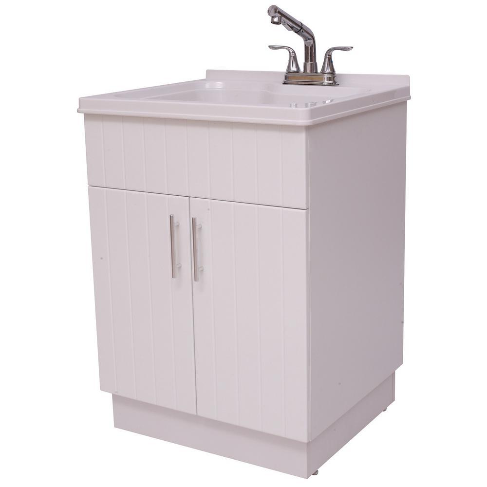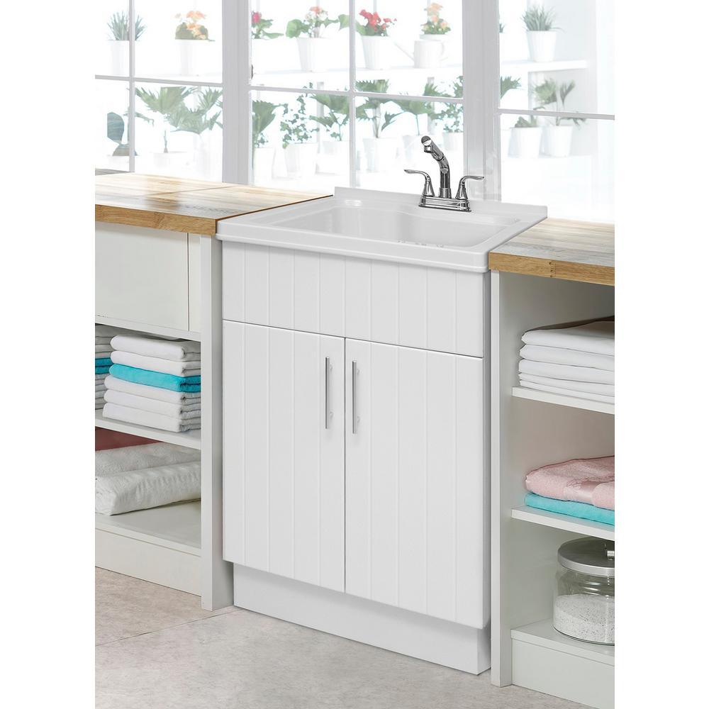 This Presenza utility sink and storage cabinet is the perfect way to give your laundry room a sleek, modern look. This modern style cabinet is ideal for storage of laundry products. Convenient chrome pull-out two-handle faucet.