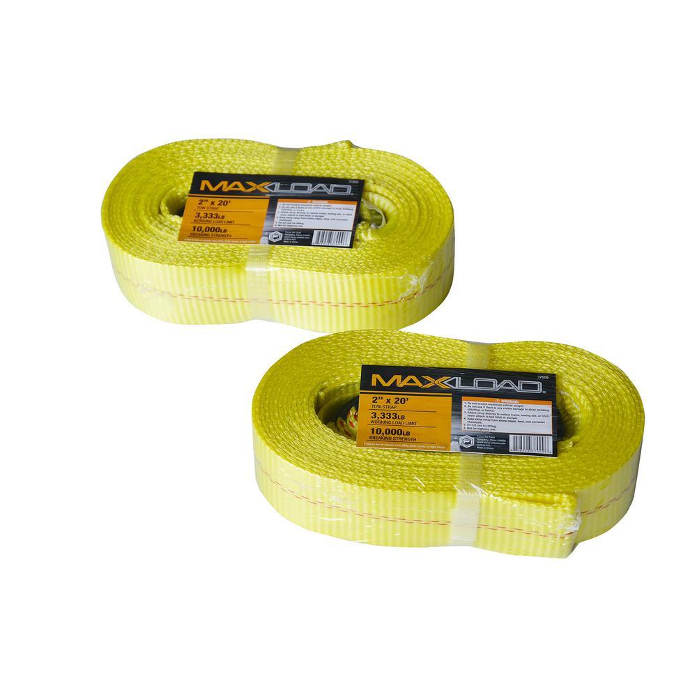 The Max Load 2 pack 2 in. x 20 ft. Tow Strap is perfect for recovering Cars, ATVs, SUVs, Boats or light trucks. The abrasion and weather-resistant polyester web strap will not tear or rot when used in extreme conditions. This Tow Strap has reinforced construction for maximum strength and versatility and has a breaking strength of 10,000 lbs. Includes eye loops on both ends that provide quick and easy attachment to tow hooks or hitch balls. This Max Load 2 pack Tow Straps is ideal for Mechanics, Farmers and anyone hauling heavy objects.