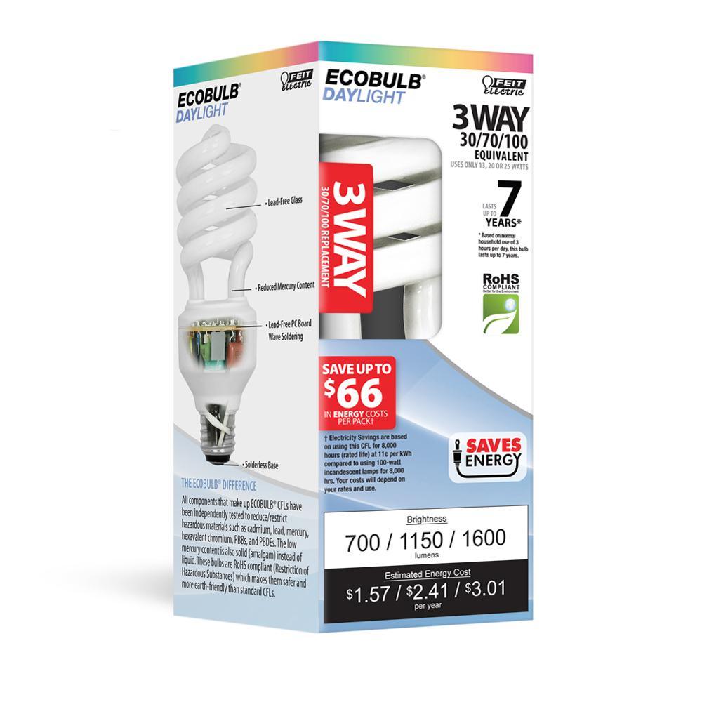 Simulate the brightness and vividness of natural daylight with this energy-efficient spiral CFL light bulb from Feit Electric. As a 3-Way compact fluorescent bulb, each lamp puts out a substantial 700, 1150 or 1600-Lumens of light using just 13, 20 or 25-Watt of power, consuming substantially less electricity than a 30, 70 or 100-Watt incandescent equivalent. That translates to a savings of up to 75% less energy than your standard incandescent replacement. The 6500K color temperature is stark and bright, suitable for any indoor or enclosed outdoor fixture that accepts a standard-sized E26 medium base.
