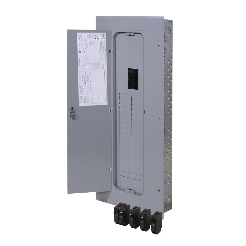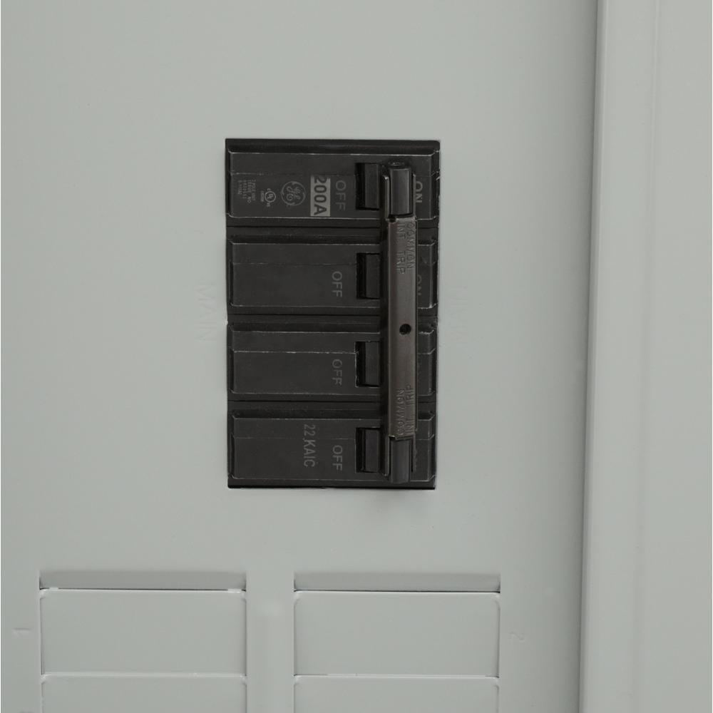 The GE PowerMark Gold 200 Amp 32-Space 64-Circuit Main Breaker Indoor Load Center Contractor Kit is pre-packaged with a selection of circuit breakers. The UL-listed load center has holes rated 100% split neutral on each side that are compatible with #14-4 wire. The breaker box is a single-phase, 3-wire unit with a factory-installed main breaker. The center is designed and built for faster installation and a more dependable performance. This unit is compatible with DFs, GFCIs, AFCIs and standard circuit breakers.