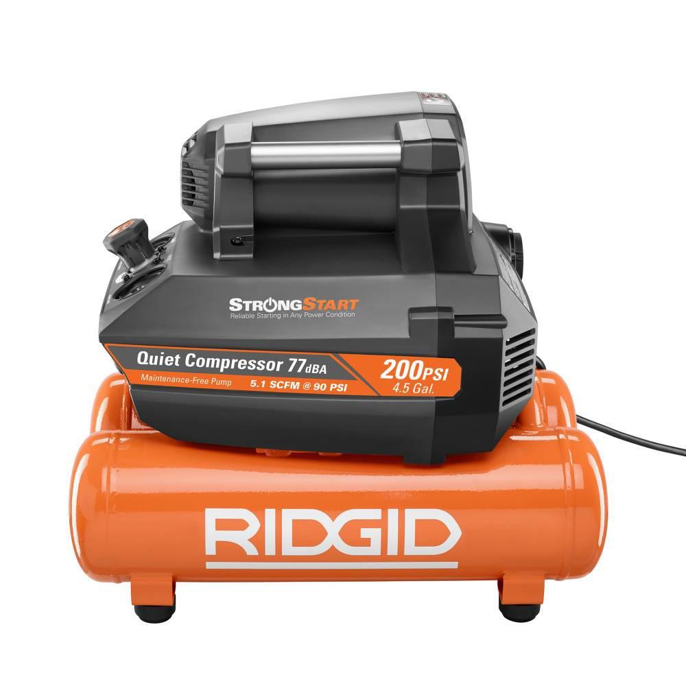 RIDGID introduces the 4.5 Gal. Portable Electric Strong Start Air Compressor with 15° 1-3/4 in. Coil Roofing Nailer. This 200 PSI. 4.5 gal compressor comes in at 77 dB making this unit up to 75% quieter than leading competitor units and great for jobsites and keeping the crew working all day. Strong Start Technology allows this unit to start reliably in any power condition. This unit is also up to 61% more compact than leading competitor units allowing for easier transport and storage, without sacrificing any power. The 4.5 Gal. compressor is backed by the RIDGID 3-Year Limited Warranty. This combination kit comes with the 15° 1-3/4 in. Coil Roofing Nailer, a contractor's bag, and operator's manuals. All RIDGID Nailers are backed by the Industry's only Lifetime Service Agreement.