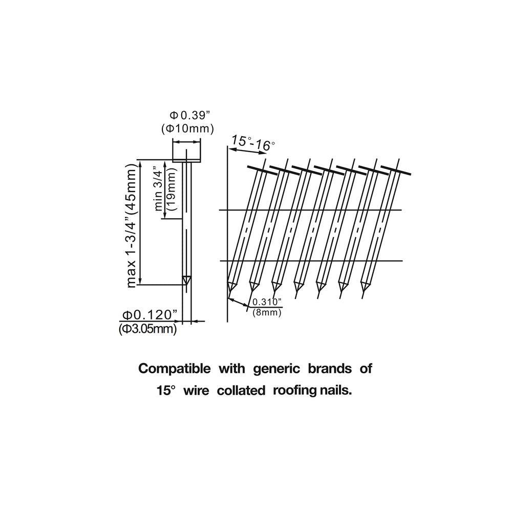 Compatible with 15° wire collated roofing nails from 3/4 in. to 1-3/4 in.