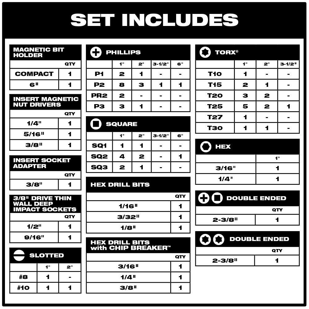 • Also includes: (6) Hex Shank Drill Bits: 1/16", 3/32", 1/8", 3/16", 1/4”, 3/8"; (3) Insert Magnetic Nut Drivers: 1/4", 5/16", 3/8"; Insert Socket Adapter: 3/8"; (2) 3/8" Drive Thin Wall Deep Impact Sockets: 1/2", 9/16
