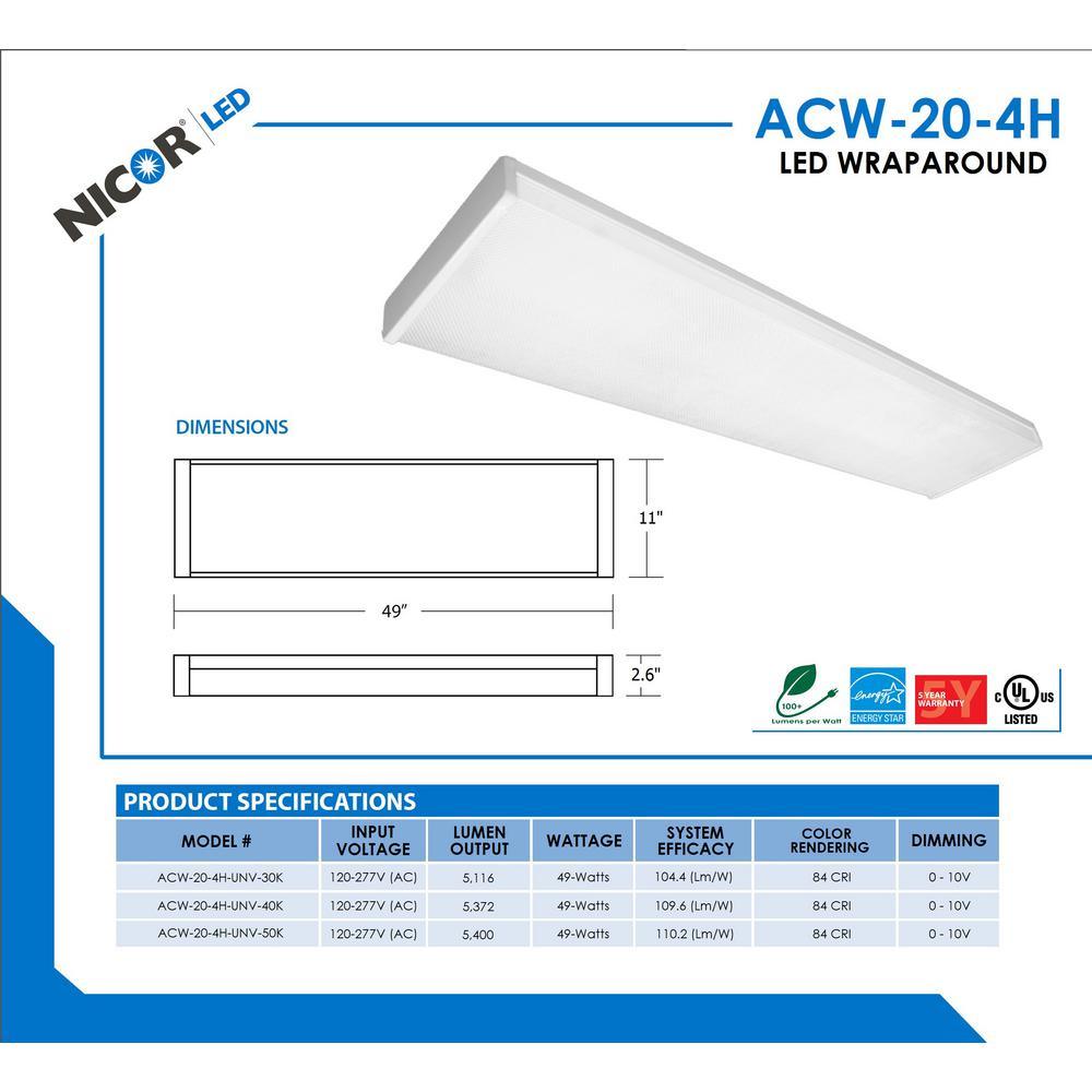 NICOR's High Output ACW Series LED Wraparound provides a similar look to that of a traditional fluorescent wrap, but with the benefits of LED integration. The Energy Star Rated LED Wrap doubles the light output of traditional fluorescent wraparounds, while using less than half the energy. The Fully Dimmable ACW is the perfect energy-saving replacement for both remodel and new construction applications in residential and commercial settings. The ACW emits over 5,000 Lumens while using only 49-Watt of energy. This wraparound also features a beautiful Prismatic Acrylic diffuser and is rated for over 60,000 hours of life and never requires bulbs. Choose from 3000K, 4000K, or 5000K Color Temperatures. The ACW features dual 120 and 277 input Voltage making it perfect for kitchens, garages, utility rooms, schools, offices and hospitals. The ACW is also protected by NICOR's 5 Year Limited Warranty.
