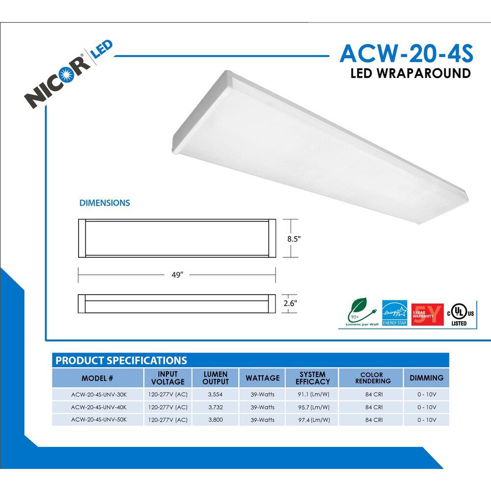 NICOR's ACW Series LED Wraparound provides a similar look to that of a traditional fluorescent wrap, but with the benefits of LED integration. The Energy Star Rated LED Wrap exceeds the light output of traditional fluorescent wraparounds, while using less than half the energy. The Fully Dimmable ACW is the perfect energy-saving replacement for both remodel and new construction applications in residential and commercial settings. The ACW emits over 3,500 Lumens while using only 39-Watt of energy. This wraparound also features a beautiful Prismatic Acrylic diffuser and is rated for over 60,000 hours of life and never requires bulbs. Choose from 3000K, 4000K, or 5000K Color Temperatures. The ACW features dual 120 and 277 input Voltage making it perfect for kitchens, garages, utility rooms, schools, offices and hospitals. The ACW is also protected by NICOR's 5 Year Limited Warranty.