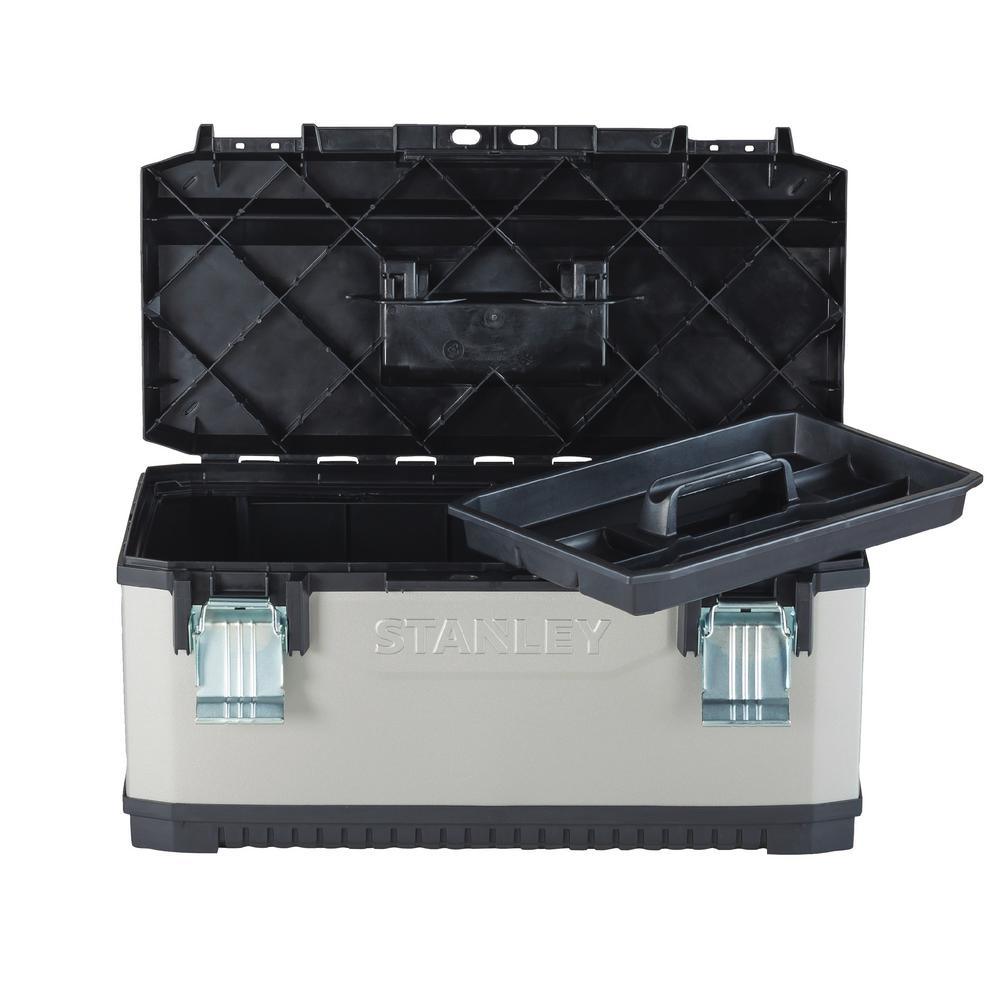 The Stanley FATMAX 26 in. Metal-Plastic Tool box features a tough material combination of a metal body design along with a resin frame. Includes a removable vertical storage unit inside for organization and easy access. It has a long metal hinge to allow the user to carry the heavy-loads, along with large metal latches that are heavy-duty, strong and rustproof.