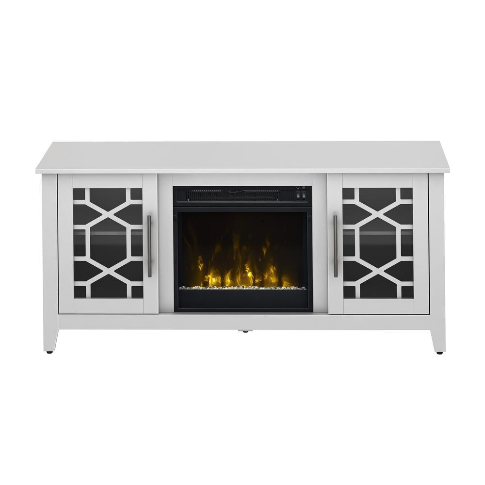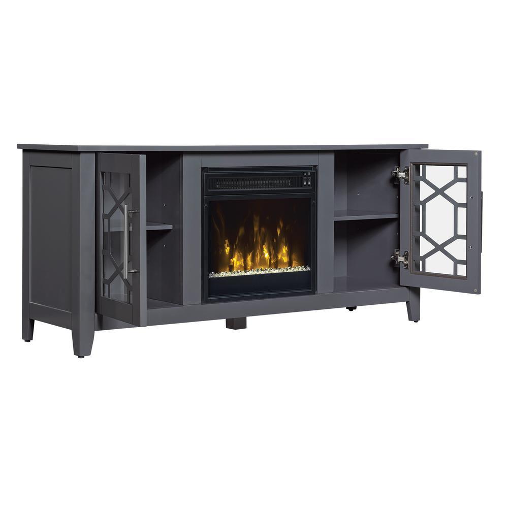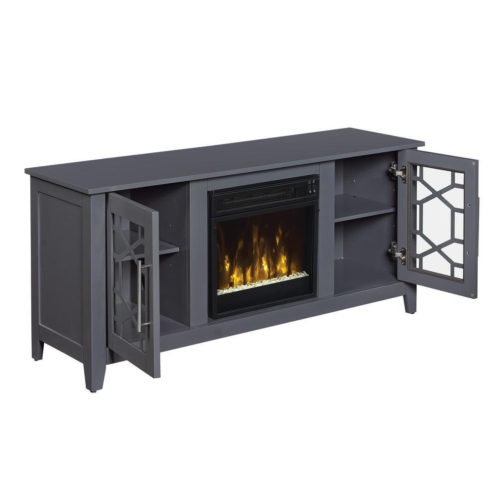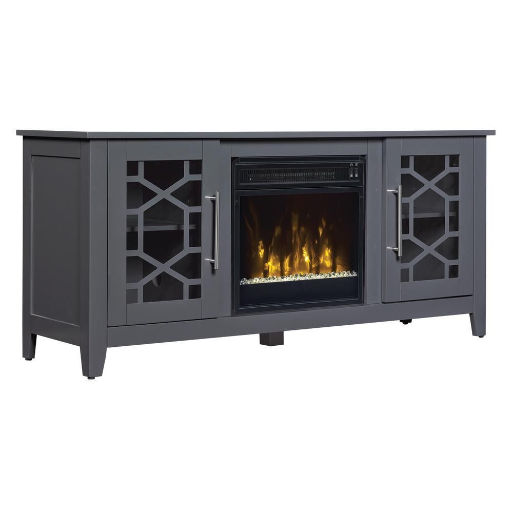 For a piece with obvious charm and grandeur, rely on this TV stand with an electric fireplace to steal the show. A stately Cool Gray finish with Brushed nickel hardware and tapered feet make this classical contemporary piece perfect for creating an upscale look. The spacious side cabinets with adjustable shelves provide storage for media components and entertainment accessories. Exquisite gray mullions and T-bar handles adorn the wood-framed, tempered glass cabinet doors. This TV stand accommodates most flat screen TVs up to 60 in. and up to 75 lbs. This stunning electric fireplace provides supplemental zone heating for up to 400 sq. ft. You can activate the flame effects with or without heat to enjoy a gentle rolling fire all year long. Choose between included contemporary fire glass media or a realistic log set and ember bed to showcase the beautiful flames.