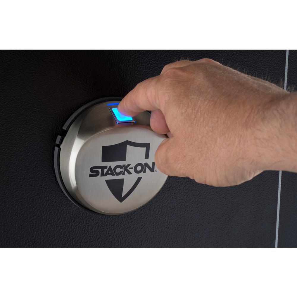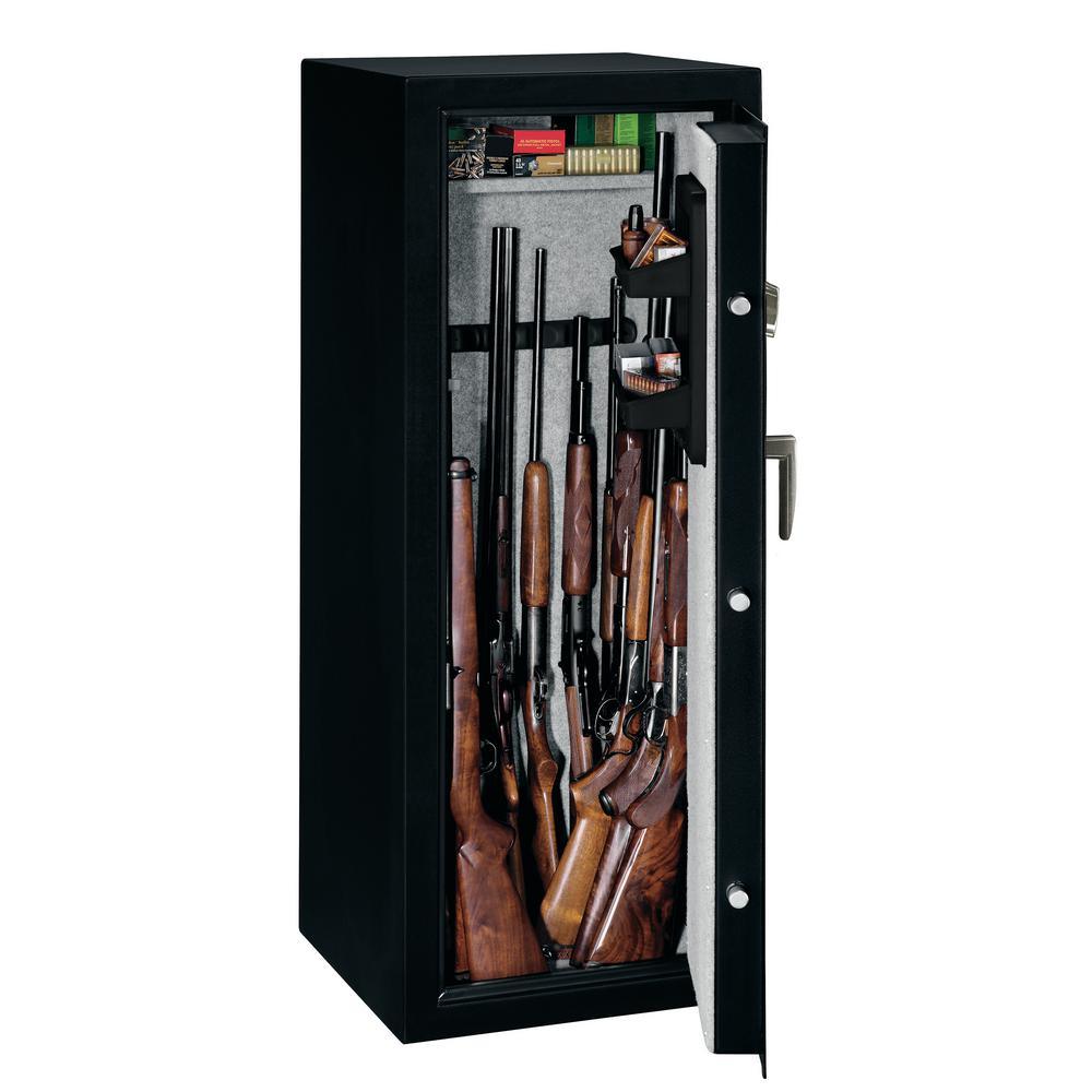 This 16-gun capacity SS-Series safe offers the protection of heavy-gauge steel, live-action locking bolts, and a biometric fingerprint lock that saves you from remembering combinations. The interior accommodates up to 16 long guns in total, with standoffs to store up to six scoped rifles.The single removable shelf mounts with a gap at the back to accommodate long guns; and for additional storage a molded two-tray organizer is factory installed on the door.