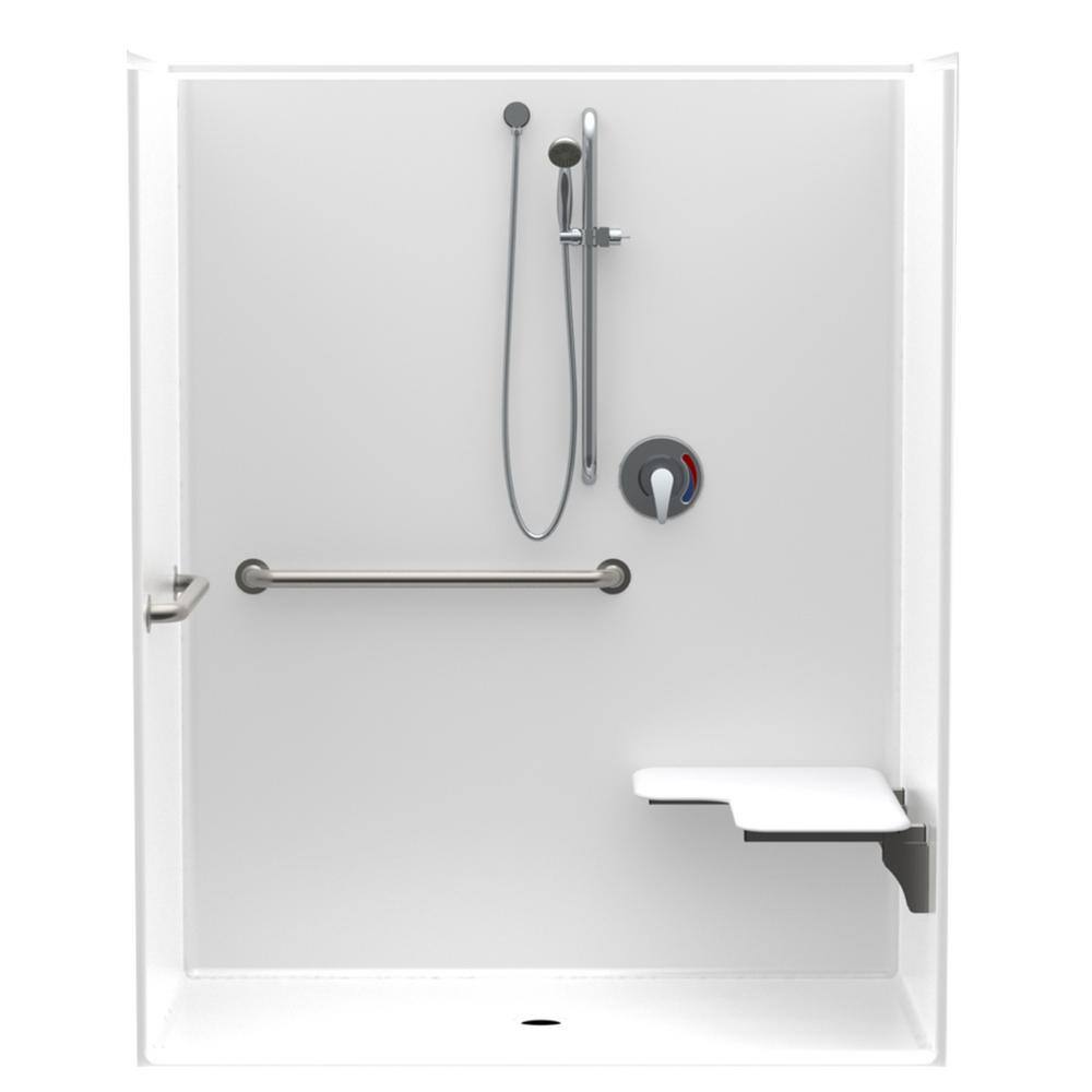 This 1-piece ADA shower stall with a right seat and grab bars is designed for wheelchair accessibility. Crafted with AcrylX applied acrylic and strengthened with Armorcore, it has a wide opening and low threshold for easy movement. The barrier-free unit includes a pressure-balancing mixing valve and hand-held shower with slide bar assembly, per ADA guidelines. Its smooth, high-gloss finish and slip-resistant textured floor add both style and safety.