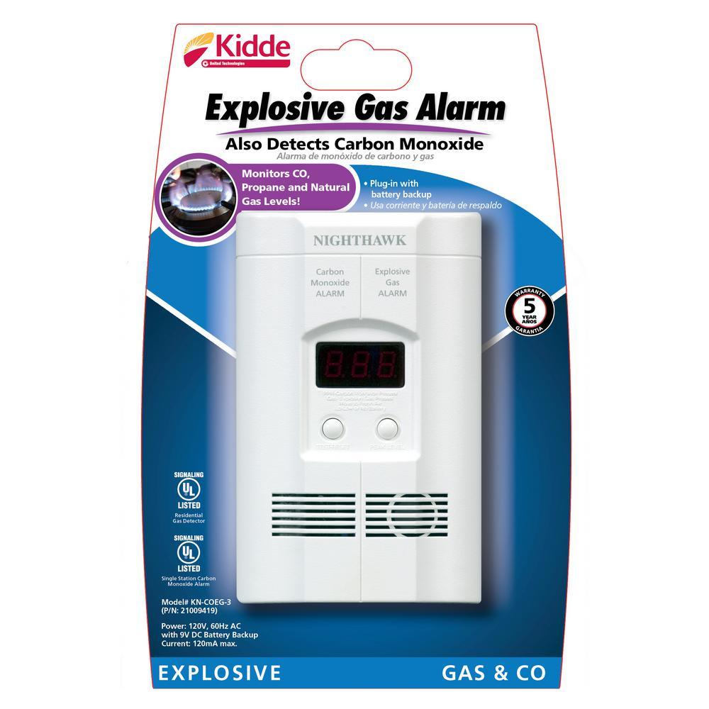 The Kidde KN-COEG-3 AC powered, plug-in CO and explosive gas alarm protects you and your family from 2 deadly threats. The KN-COEG-3 includes 9-Volt battery back up that provides protection during a power outage, when AC-only units cannot provide protection. By pressing the Peak Level Button you can see the peak CO level recorded by the alarm since it was last reset or unplugged. The continuous digital display shows you the level of carbon monoxide (if any) the unit is sensing as well as if gas is present. The gas sensor is a metal oxide sensor designed to detect natural gas (methane) or propane.