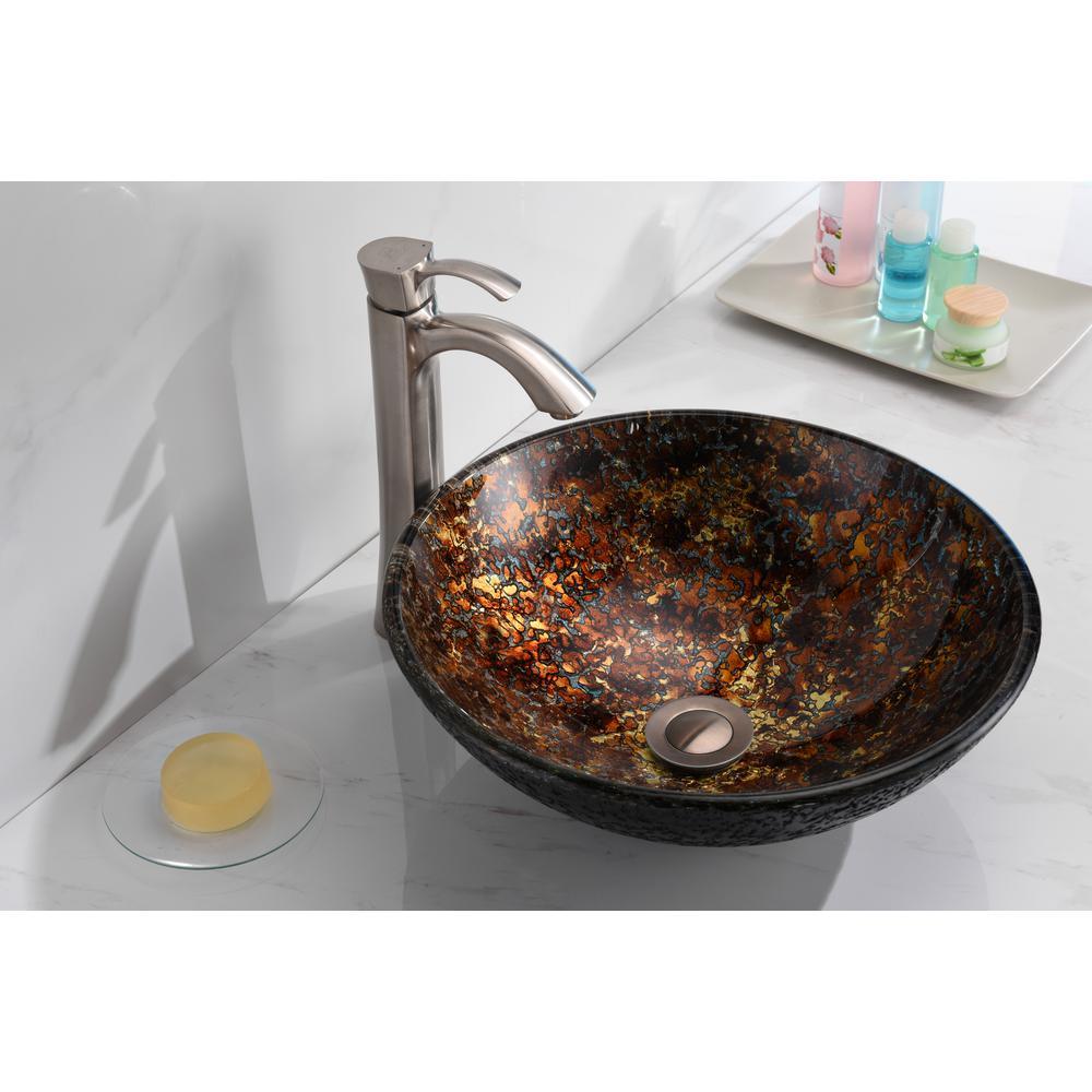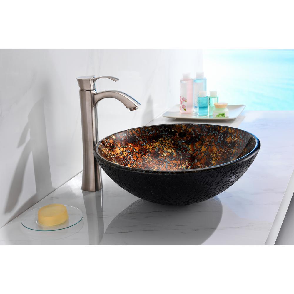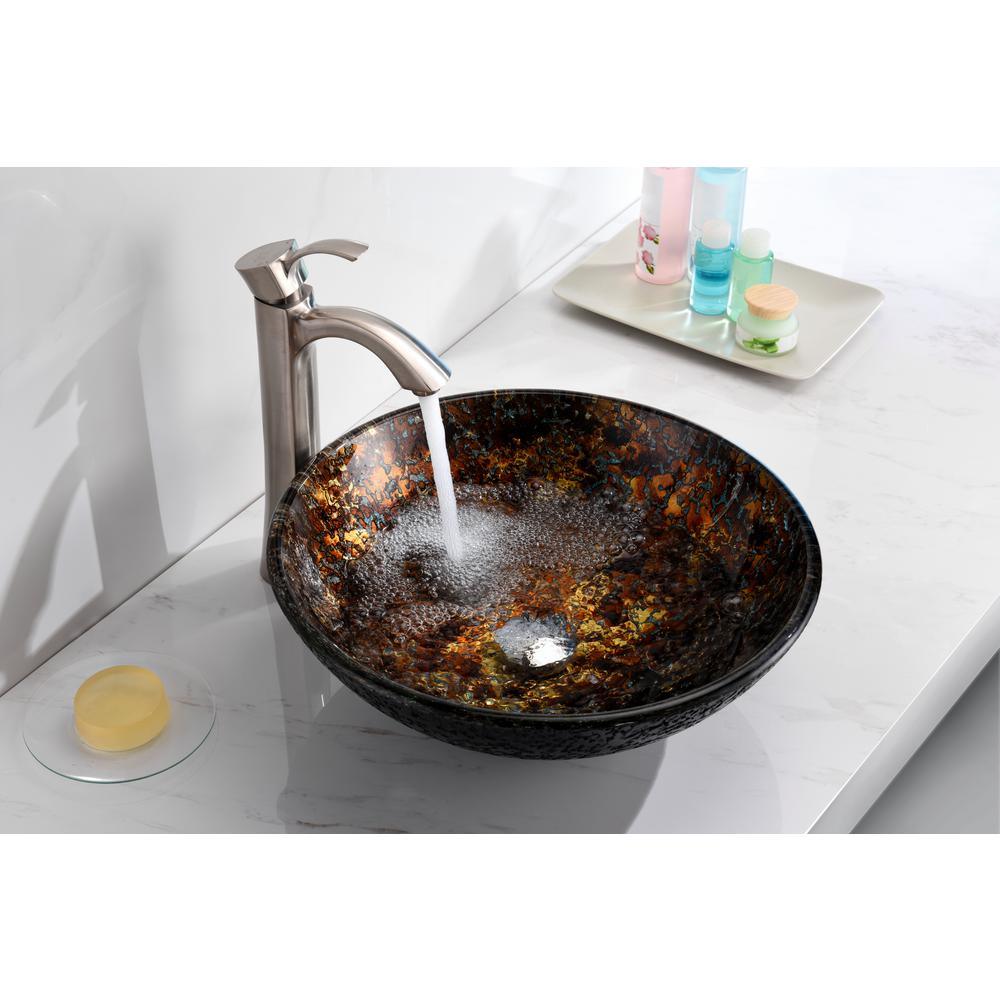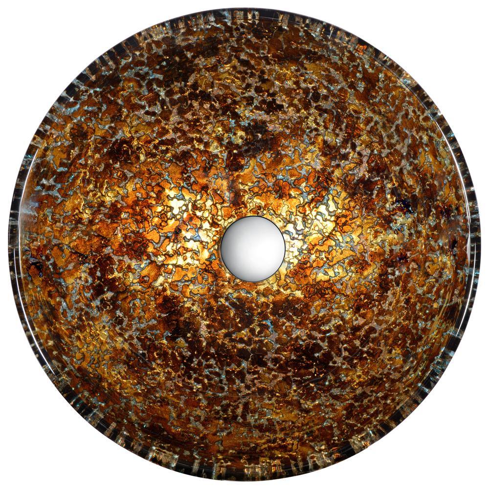 The ANZZI Alto Series sink is a traditionally crafted round vessel sink adorned in a molten Gold finish. Each ANZZI vessel sink if formed using Rhino alloy certified high tempered Deco-Glass material. The result is an elegantly shaped and captivating vessel centerpiece for any bathroom counter.