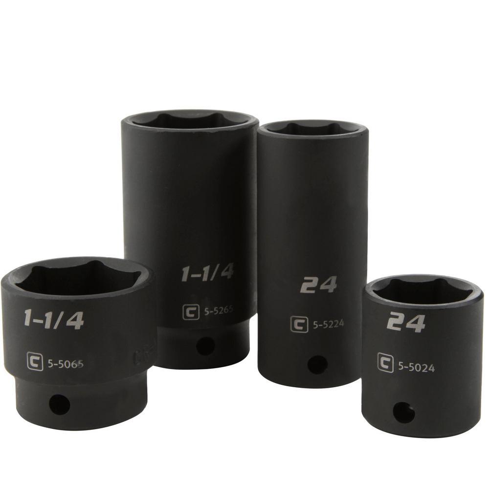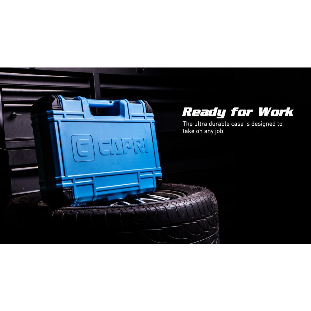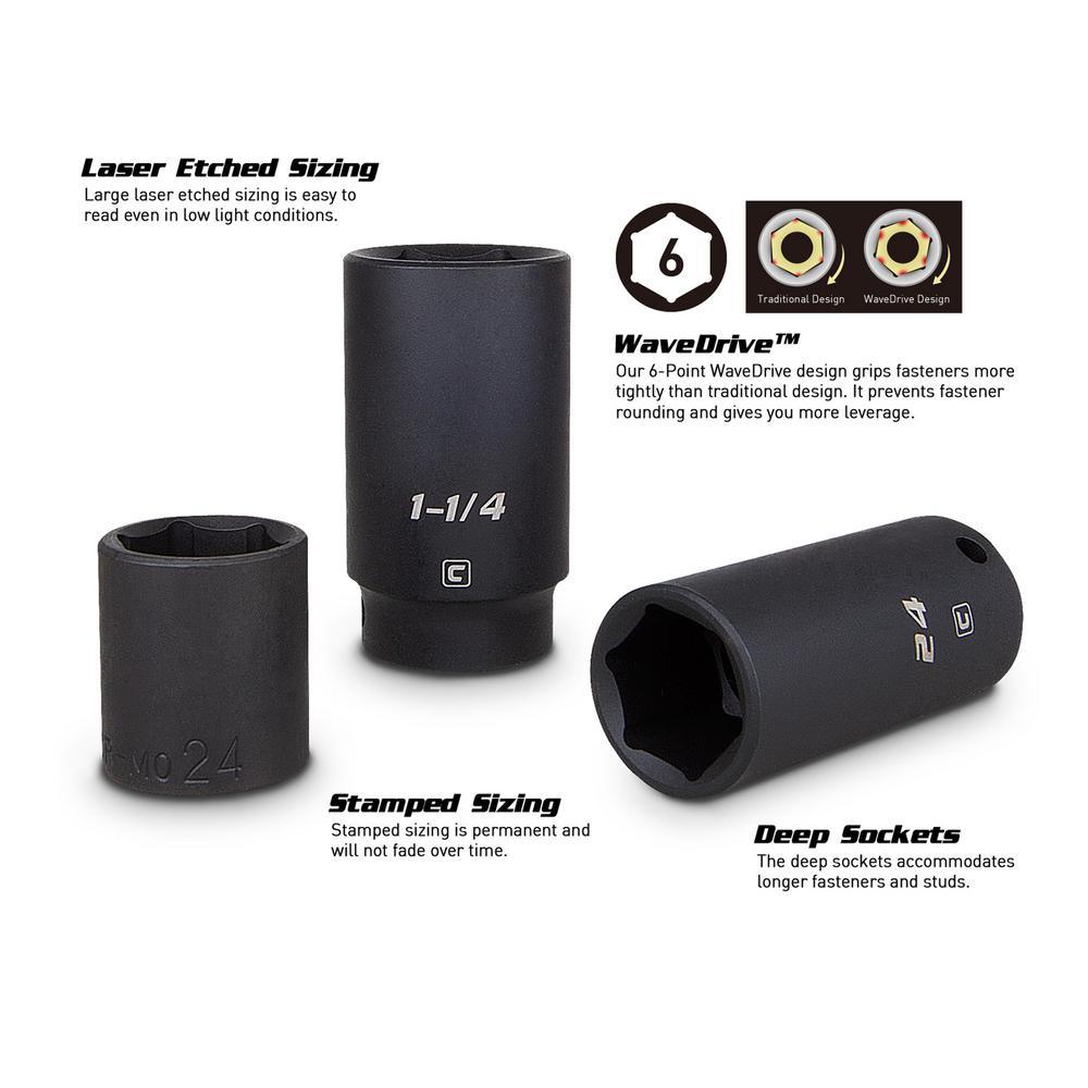 The Capri Tools 1/2 in. Drive Master Impact Socket Set is a complete collection of the most frequently used sockets and accessories. Organized by size in a specially made impact-resistant tool case, the impact sockets and accessories stay where they are as you carry them around. They are durable and specifically made to withstand high torque from power tools. Each item is expertly coated with manganese phosphate, the preferred coating in military and aerospace, which offers superior protection and corrosion resistance compared to black oxide coating on other impact sockets. The 6-point WaveDrive design grips fasteners more tightly than traditional design, preventing fastener rounding and giving you more leverage. Meets and exceeds ASME B107.110 standards. This master set includes: (28) 1/2 in. drive standard impact sockets: 10, 11, 12, 13, 14, 15, 16, 17, 18, 19, 20, 21, 22, 24 mm, 7/16, 1/2, 9/16, 5/8, 11/16, 3/4, 13/16, 7/8, 15/16, 1, 1-1/16, 1-1/8, 1-3/16, 1-1/4 in.; (28) 1/2 in. drive deep impact socket: 10, 11, 12, 13, 14, 15, 16, 17, 18, 19, 20, 21, 22, 24 mm, 7/16, 1/2, 9/16, 5/8, 11/16, 3/4, 13/16, 7/8, 15/16, 1, 1-1/16, 1-1/8, 1-3/16, 1-1/4 in.; four 1/2 in. drive impact extension bars: 3, 5, 10, 15 in.; one 1/2 in. drive impact universal joint.