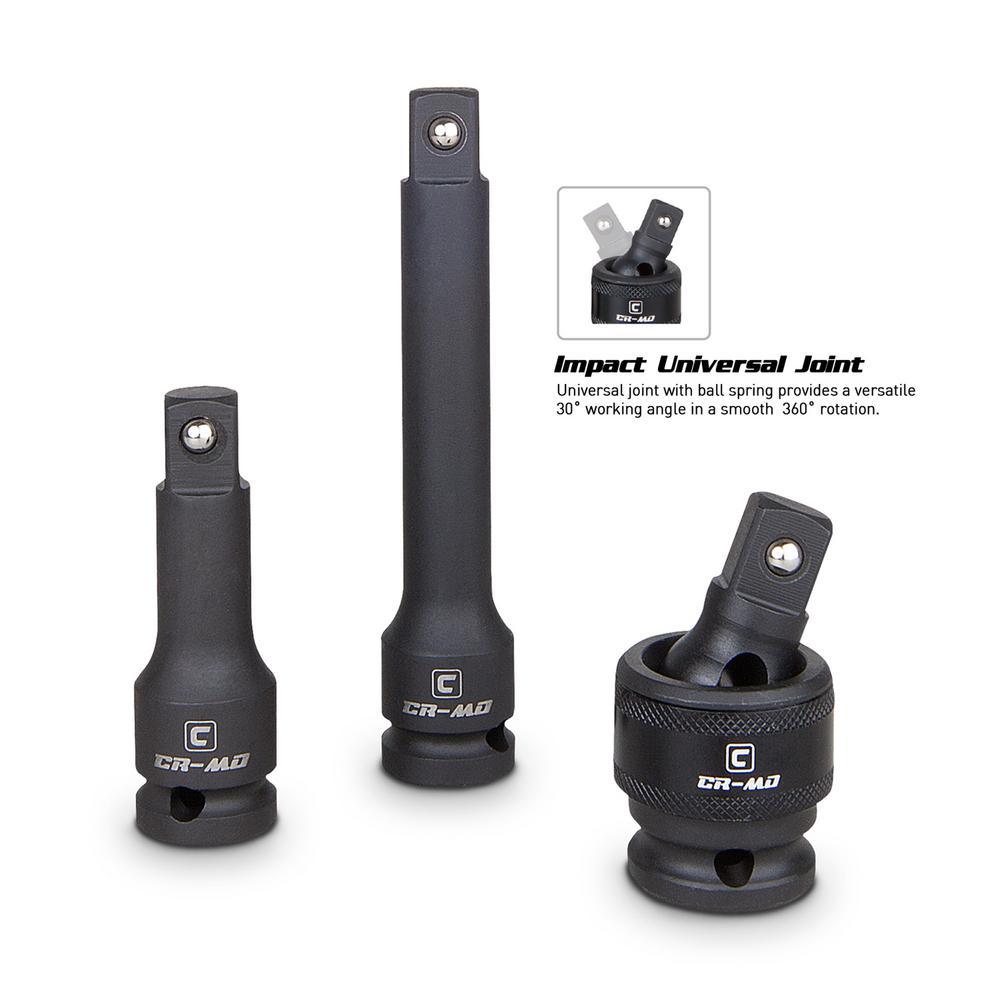 • 61-piece set includes (28) 1/2 in. drive standard impact sockets, (28) 1/2 in. drive deep impact sockets, (4) 1/2 in. drive impact extension bars, (1) 1/2 in. drive impact universal joint