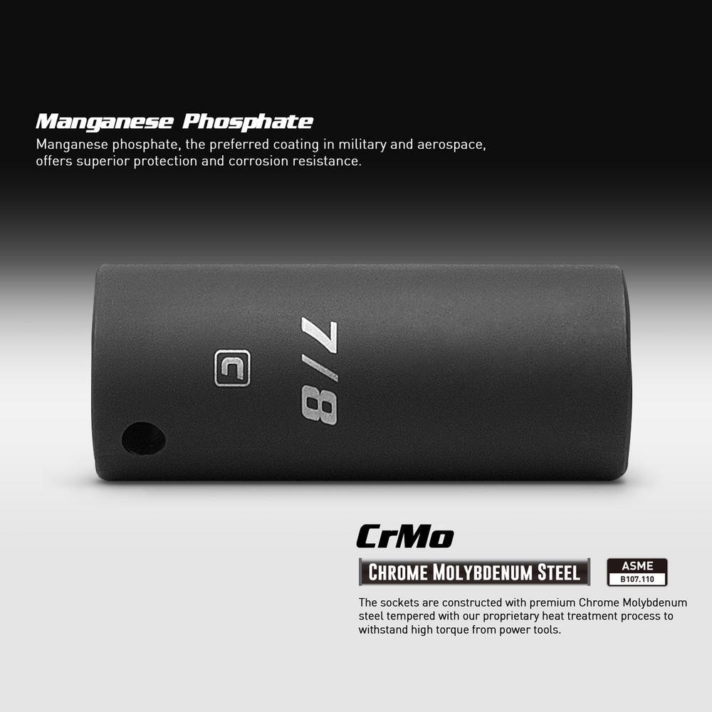 • Expertly coated with manganese phosphate, the preferred coating in military and aerospace, which offers superior protection and corrosion resistance compared to black oxide coating on other impact sockets