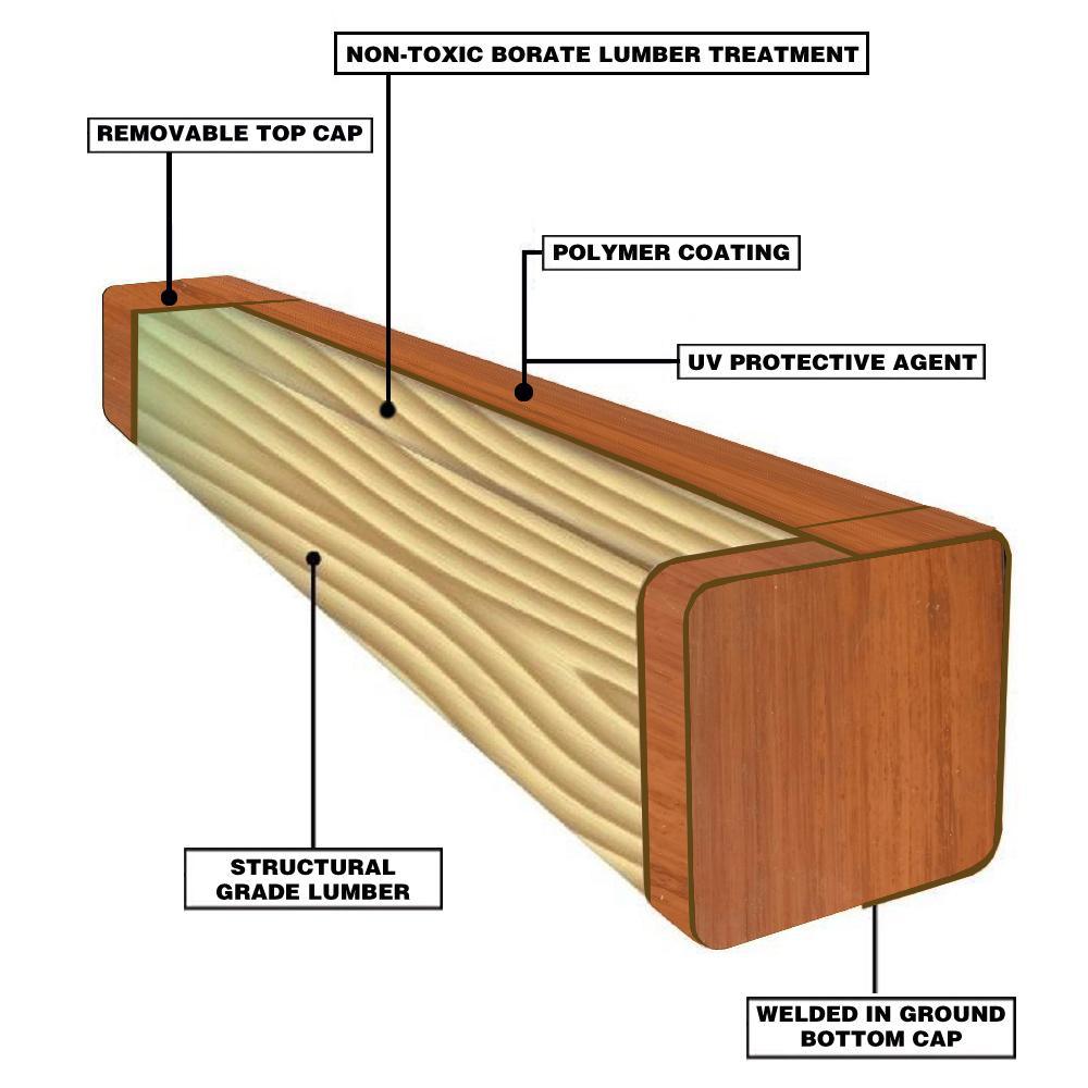Woodguard posts are engineered to last by combining the strength of structural lumber with a low maintenance high-tech, permanent, polymer coating. Woodguard post are treated to prevent rot and insect damage above and below ground level while making the wood core resistant to the warping, twisting and splitting. Woodguard posts are much stronger than unreinforced vinyl posts and will not become brittle in cold weather. These structural posts have many versatile uses such as; fence posts porch posts, ranch rail posts, picket fence posts, flexible horse fence posts, privacy fence posts, gate posts, mail box post, vinyl or plastic lattice posts, deck railing post, landscaping retaining wall posts, planter boxes, play structures, outdoor furniture to name a few.