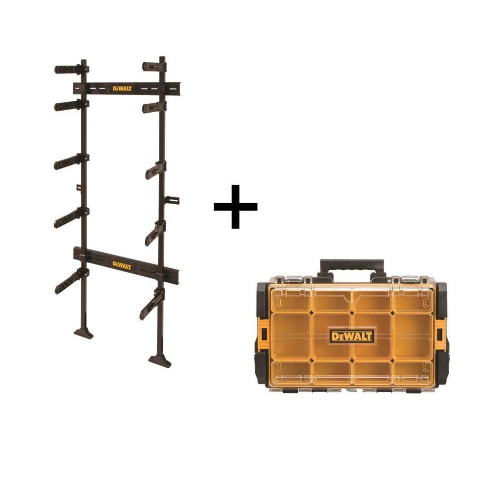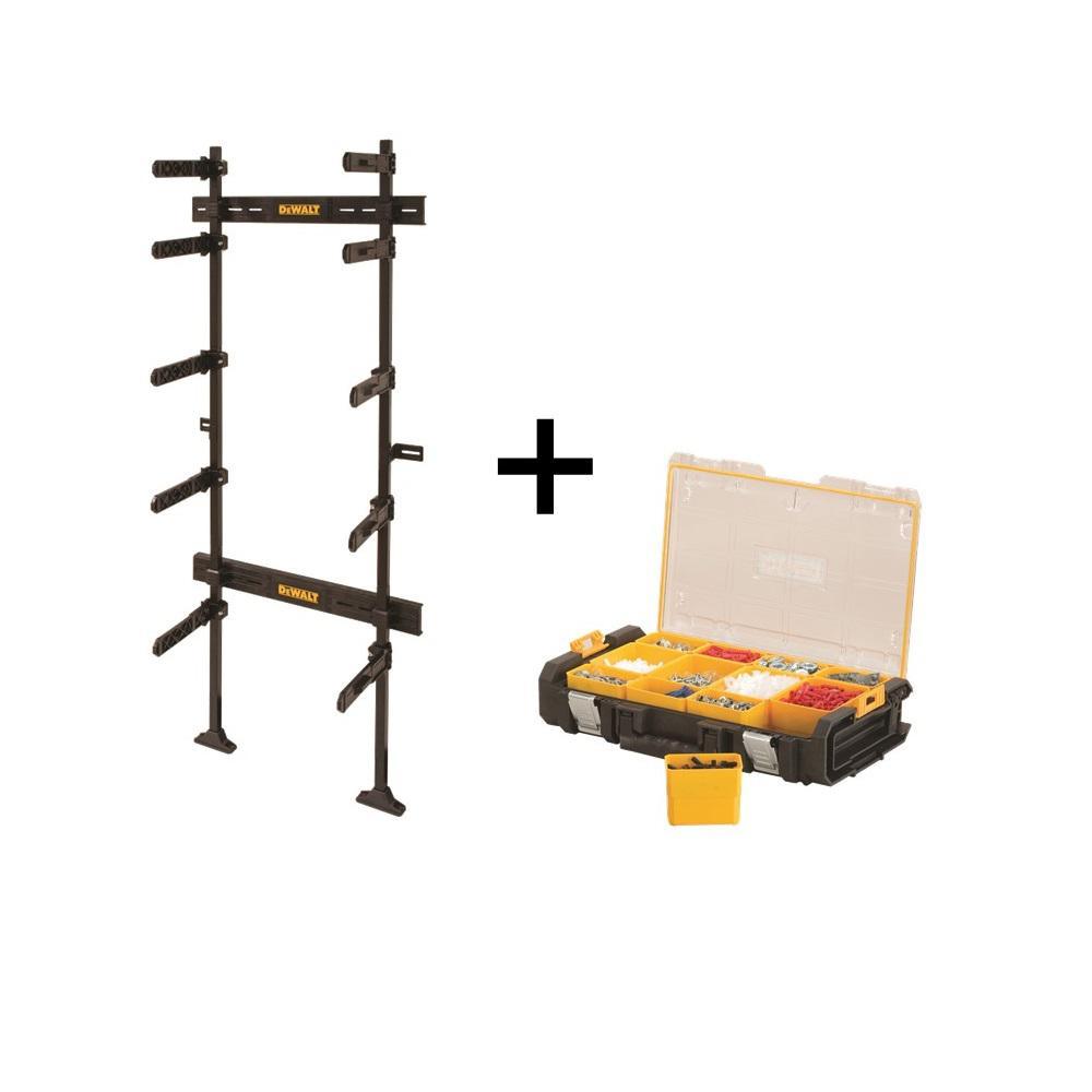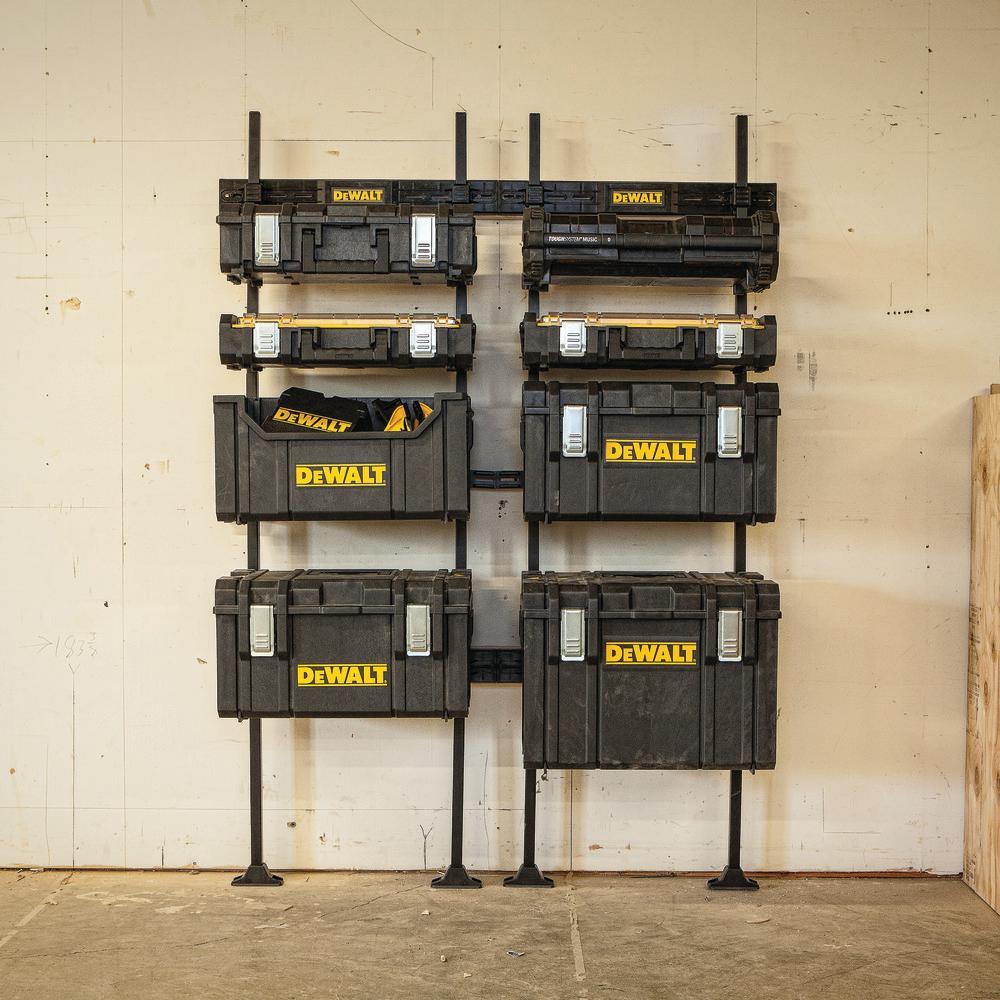 DEWALT TOUGHSYSTEM Workshop Racking System enables the storage and organization of TOUGHSYSTEM modules. This rack allows a flexible variety of arrangements allowing users to modify the workshop to meet their storage needs. The DWST08270 comes with the TOUGHSYSTEM Workshop racking system as well as a TOUGHSYSTEM clear lid organizer.