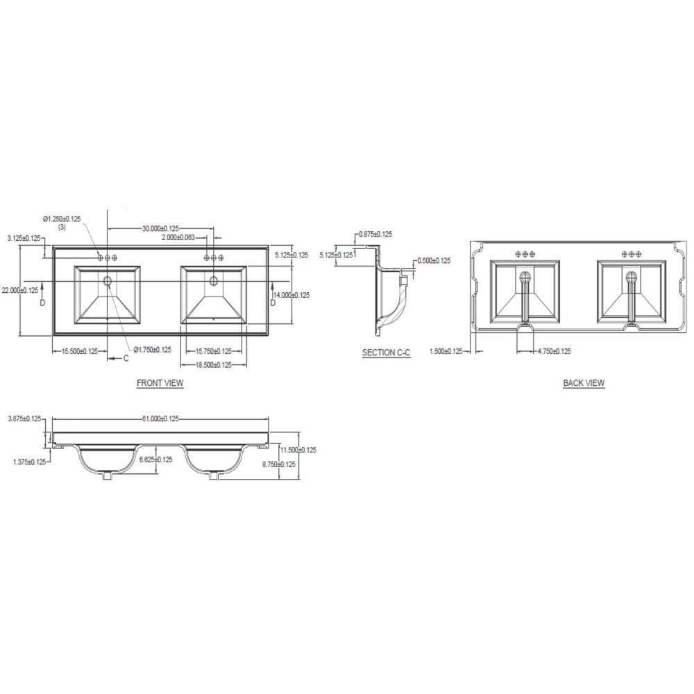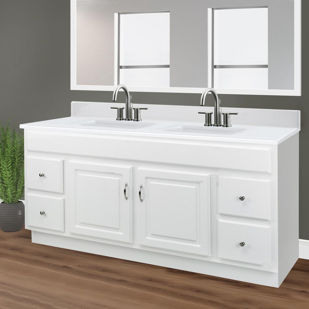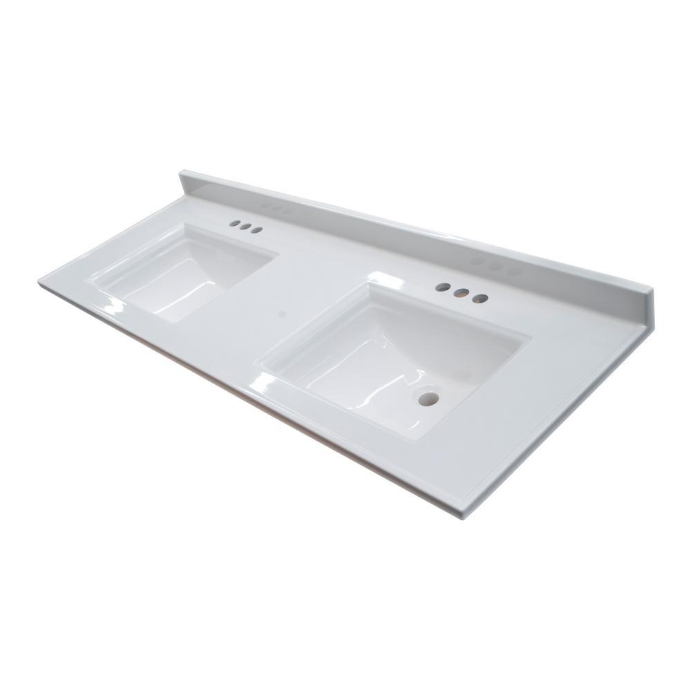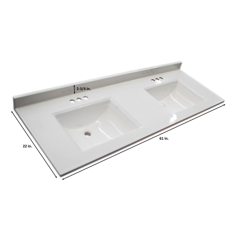 The Design House 557678 Camilla Double bowl Vanity Top with 4 in. Backsplash gives your bathroom a stylish, versatile look that also provides added functionality. This double-bowl vanity top measures 61 in. wide by 22 in. deep. Each sink has 3 pre-drilled holes that allow for a 4 in. center mount faucet. The drip-free edge is lifted to contain excess water. The backsplash helps prevent mold and water damage. The Design House 557678 Camilla Double bowl Vanity Top with 4 in. Backsplash comes with a 5-year limited warranty.