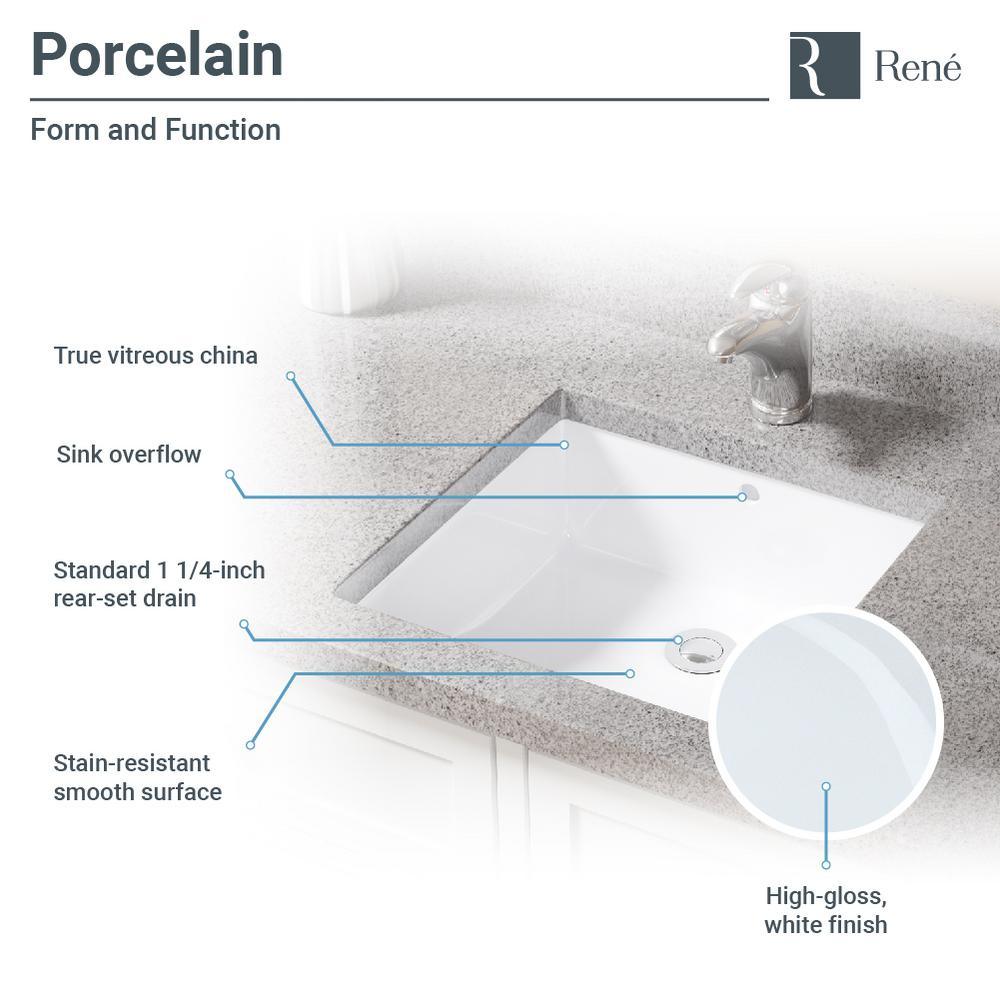 This attractive, white, porcelain basin is designed to be mounted under the counter in a flush, positive, or negative reveal. Wide and narrow, its vitreous china finish glistens with charm and durability. The R2-1003-W is constructed of solid porcelain but with a special additional enamel added at the end of its firing, turning it into a hardened, true, vitreous china. On its own, porcelain is both beautiful and durable, but the additional vitreous china coating creates an even more impervious and sanitary surface. It measures 17 in. x 17-1/2 in. x 7-1/2 in., with an offset drain and overflow. With a simple press to its handsome, brushed nickel dome; the included, spring-loaded, pop-up drain (pud) can be opened or closed.