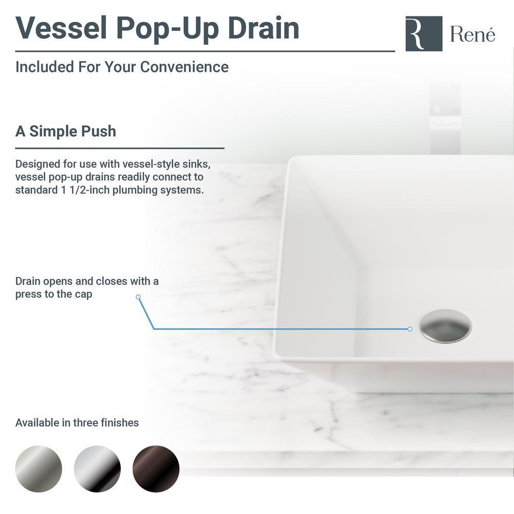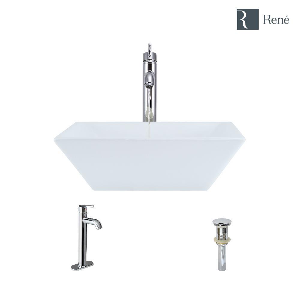This attractive, white, porcelain basin is designed to be mounted atop the counter to display its natural beauty. Rectangular in shape, its vitreous china finish glistens with charm and durability. The R2-5010-W is constructed of solid porcelain but with a special additional enamel added at the end of its firing, turning it into a hardened, true, vitreous china. On its own, porcelain is both beautiful and durable, but the additional vitreous china coating creates an even more impervious and sanitary surface. It measures 15-3/4 in. x 15-3/4 in. x 4-3/4 in. The R9-7001-C is a tall, vessel-style faucet soundly constructed of premium-quality, solid brass components. Its design is cylindrical with a chrome finish and matching baseplate. Water temperature and pressure is controlled by the rod-style, swivel handle. Ceramic disc cartridges assure dependability. With a simple press to its handsome, chrome dome; the included, spring-loaded, vessel pop-up drain (vpud) can be opened or closed.