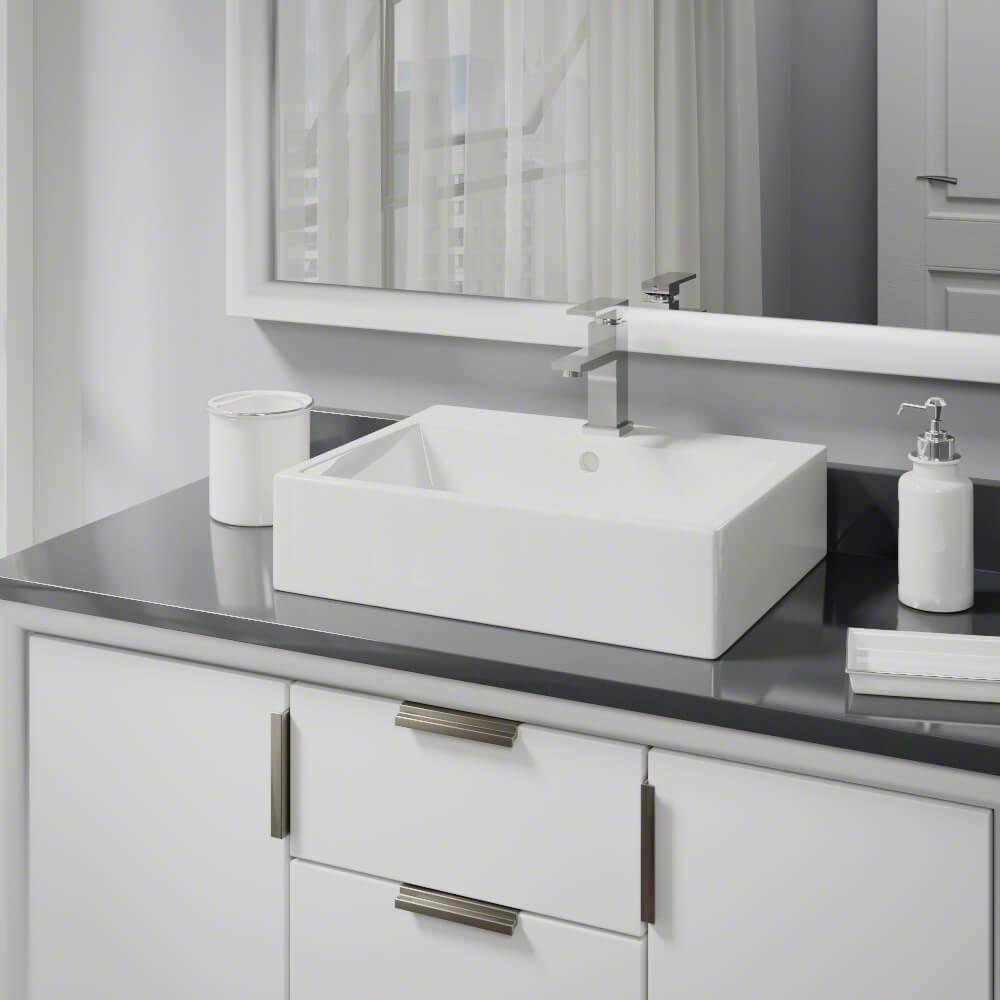 This attractive, white, porcelain basin is designed to be mounted atop the counter to display its natural beauty. Rectangular in shape, its vitreous china finish glistens with charm and durability. The R2-5018-W is constructed of solid porcelain but with a special additional enamel added at the end of its firing, turning it into a hardened, true, vitreous china. On its own, porcelain is both beautiful and durable, but the additional vitreous china coating creates an even more impervious and sanitary surface. It measures 21 in. x 16-1/4 in. x 5-3/4 in., with an offset drain, overflow, and pre-drilled faucet hole in its rear platform. The R9-7002-BN is a condensed, vessel-style faucet soundly constructed of premium-quality, solid brass components. Its design is angular with crisp edges and a brushed nickel finish. Water temperature and pressure is controlled by the extended, swivel handle. Ceramic disc cartridges assure dependability. With a simple press to its handsome, brushed nickel dome; the included, spring-loaded, vessel pop-up drain (vpud) can be opened or closed.
